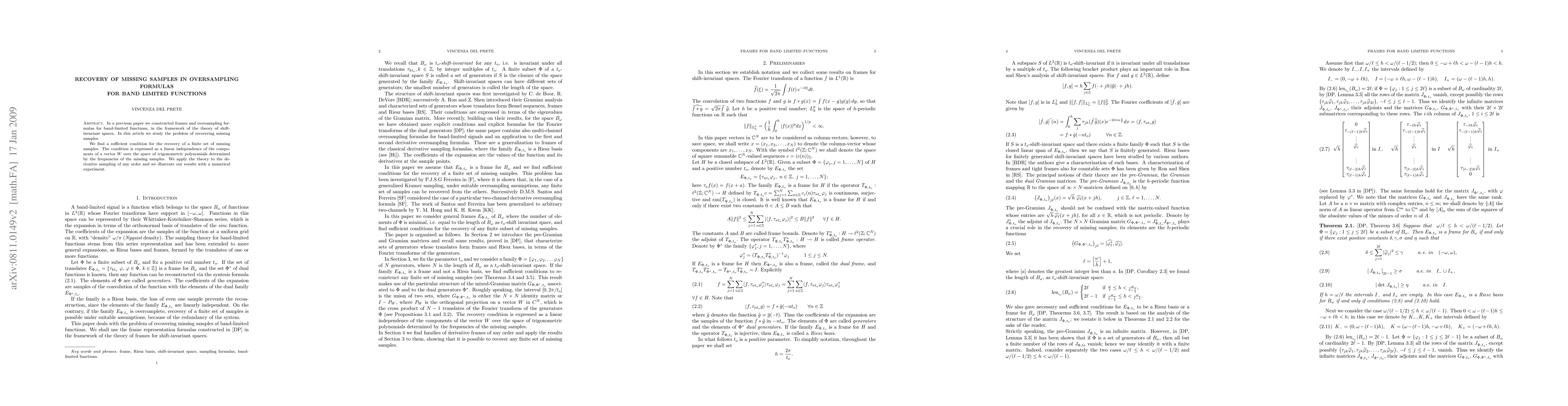 In a previous paper, the author constructed frames and oversampling formulas for band-limited functions, in the framework of the theory of shift-invariant spaces. In this article we study the problem of recovering missing samples. We find a sufficient condition for the recovery of a finite set of missing samples. The condition is expressed as a linear independence of the components of a vector W over the space of trigonometric polynomials determined by the frequencies of the missing samples. We apply the theory to the derivative sampling of any order and we illustrate our results with a numerical experiment.