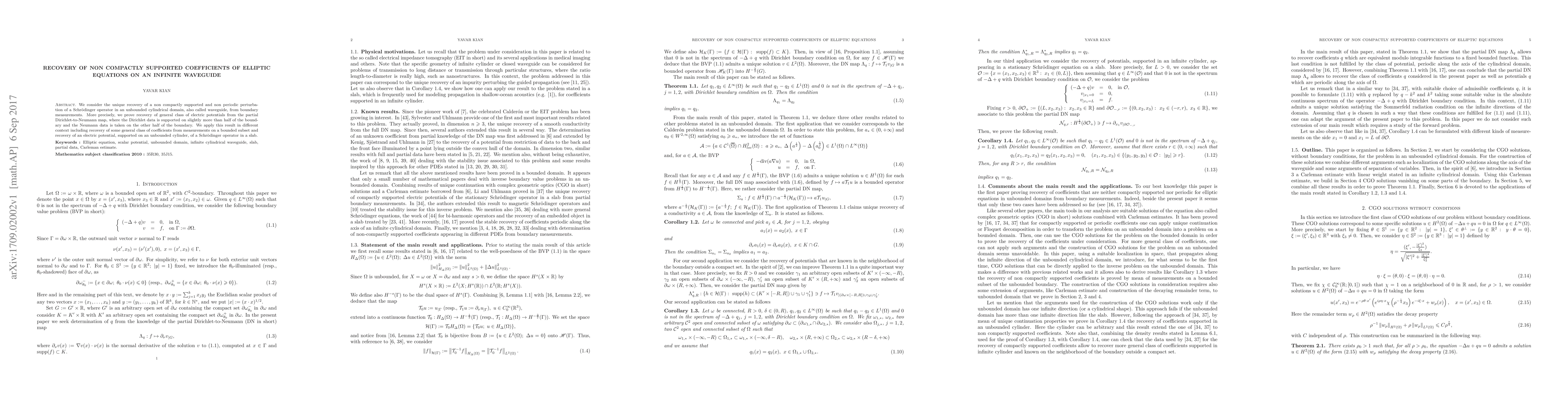 This paper addresses the recovery of non-compactly supported and non-periodic perturbations in a Schrödinger operator within an infinite waveguide from boundary measurements. The authors prove the recovery of a general class of electric potentials using the partial Dirichlet-to-Neumann map, with Dirichlet data on slightly more than half of the boundary and Neumann data on the other half.