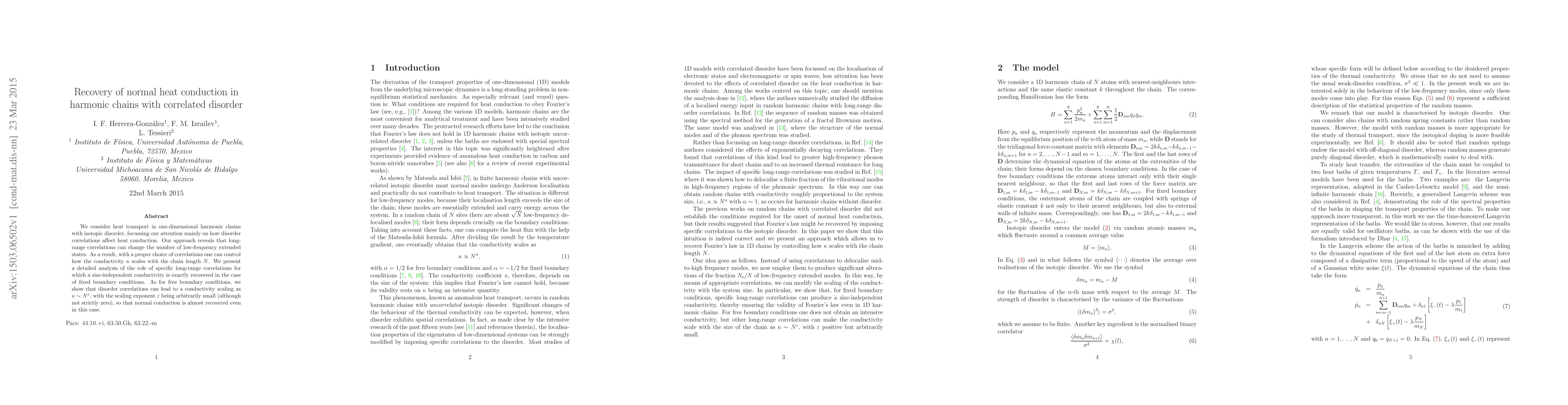 This paper explores heat conduction in one-dimensional harmonic chains with isotopic disorder, demonstrating that long-range disorder correlations can influence the number of low-frequency extended states and control the scaling of conductivity $\kappa$ with chain length $N$. Under fixed boundary conditions, it shows exact recovery of size-independent conductivity, while under free boundary conditions, it reveals near-normal conduction with a conductivity scaling $\kappa \sim N^{\varepsilon}$ where $\varepsilon$ is arbitrarily small.