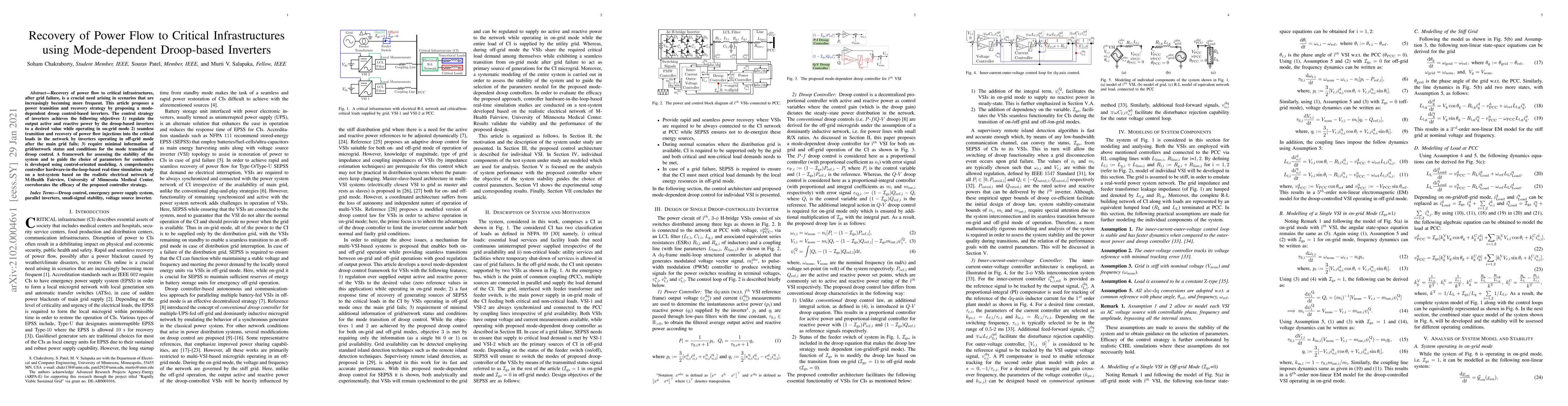 Recovery of power flow to critical infrastructures, after grid failure, is a crucial need arising in scenarios that are increasingly becoming more frequent. This article proposes a power transition and recovery strategy by proposing a mode-dependent droop control-based inverters. The control strategy of inverters achieves the following objectives 1) regulate the output active and reactive power by the droop-based inverters to a desired value while operating in on-grid mode 2) seamless transition and recovery of power flow injections into the critical loads in the network by inverters operating in off-grid mode after the main grid fails; 3) require minimal information of grid/network status and conditions for the mode transition of droop control. A framework for assessing the stability of the system and to guide the choice of parameters for controllers is developed using control-oriented modeling. A comprehensive controller hardware-in-the-loop-based real-time simulation study on a test-system based on the realistic electrical network of M-Health Fairview, University of Minnesota Medical Center, corroborates the efficacy of the proposed controller strategy.