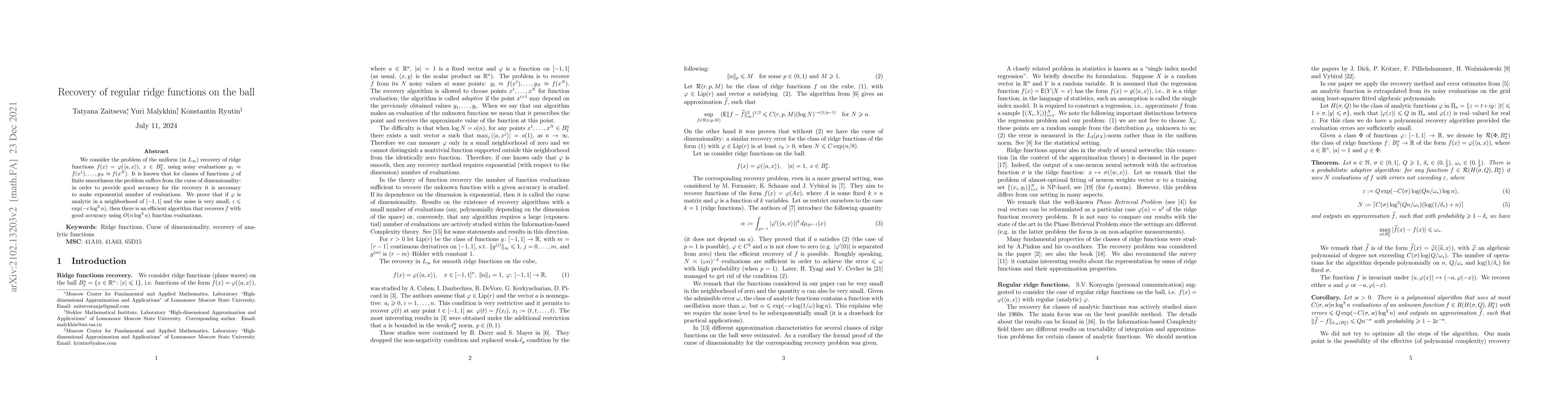 We consider the problem of the uniform (in $L_\infty$) recovery of ridge functions $f(x)=\varphi(\langle a,x\rangle)$, $x\in B_2^n$, using noisy evaluations $y_1\approx f(x^1),\ldots,y_N\approx f(x^N)$. It is known that for classes of functions $\varphi$ of finite smoothness the problem suffers from the curse of dimensionality: in order to provide good accuracy for the recovery it is necessary to make exponential number of evaluations. We prove that if $\varphi$ is analytic in a neighborhood of $[-1,1]$ and the noise is very small, $\varepsilon\le\exp(-c\log^2n)$, then there is an efficient algorithm that recovers $f$ with good accuracy using $O(n\log^2n)$ function evaluations.