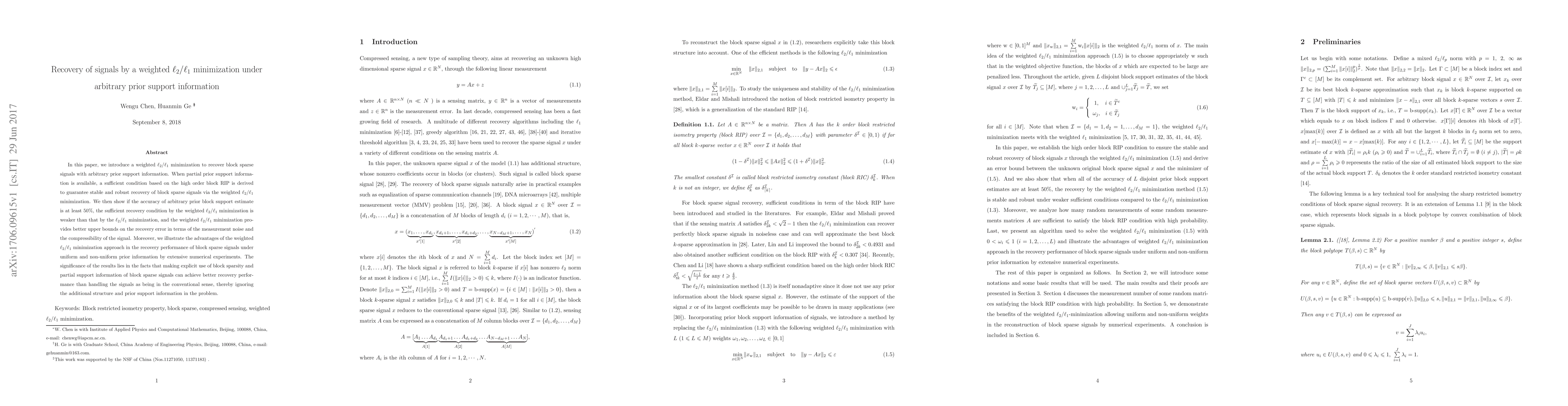 This paper proposes a weighted $\ell_2/\ell_1$ minimization method for recovering block sparse signals with arbitrary prior support information. It demonstrates that this approach provides better recovery performance and error bounds compared to conventional $\ell_2/\ell_1$ minimization, especially when partial prior support information is available.