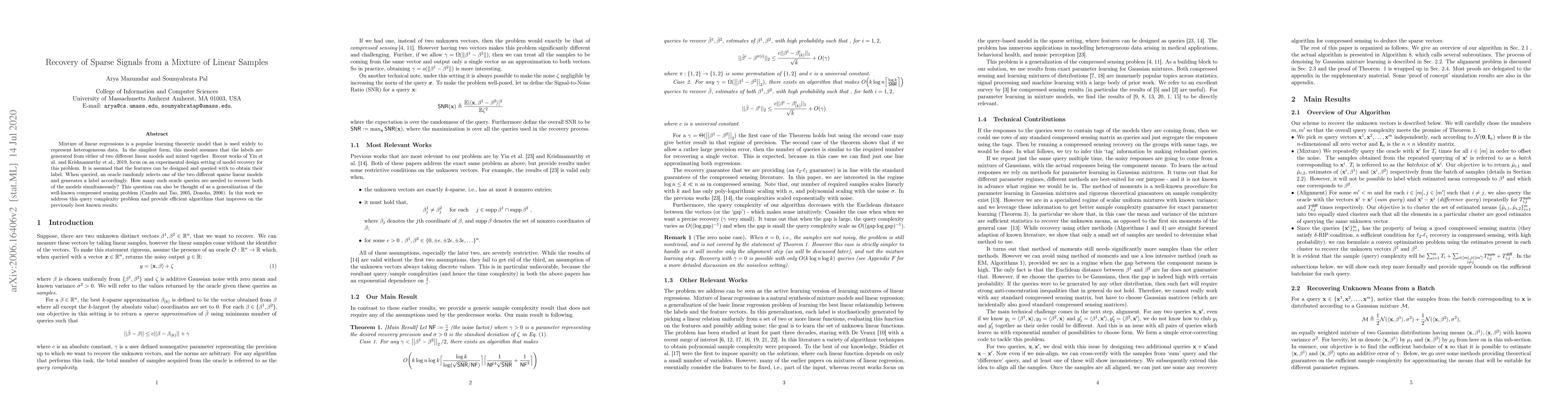 Mixture of linear regressions is a popular learning theoretic model that is used widely to represent heterogeneous data. In the simplest form, this model assumes that the labels are generated from either of two different linear models and mixed together. Recent works of Yin et al. and Krishnamurthy et al., 2019, focus on an experimental design setting of model recovery for this problem. It is assumed that the features can be designed and queried with to obtain their label. When queried, an oracle randomly selects one of the two different sparse linear models and generates a label accordingly. How many such oracle queries are needed to recover both of the models simultaneously? This question can also be thought of as a generalization of the well-known compressed sensing problem (Cand\`es and Tao, 2005, Donoho, 2006). In this work, we address this query complexity problem and provide efficient algorithms that improves on the previously best known results.