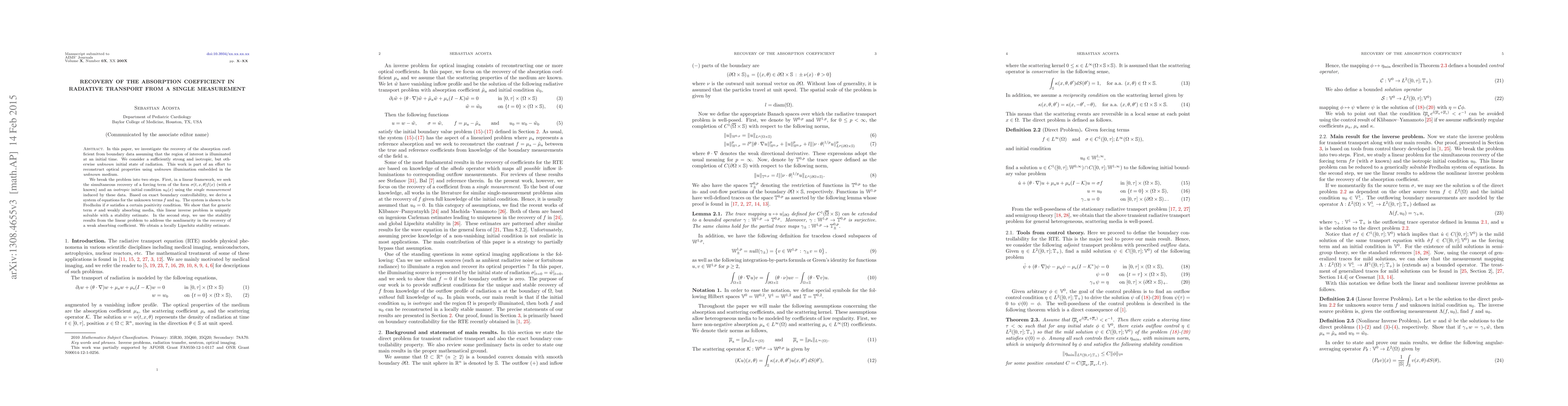 In this paper, we investigate the recovery of the absorption coefficient from boundary data assuming that the region of interest is illuminated at an initial time. We consider a sufficiently strong and isotropic, but otherwise unknown initial state of radiation. This work is part of an effort to reconstruct optical properties using unknown illumination embedded in the unknown medium. We break the problem into two steps. First, in a linear framework, we seek the simultaneous recovery of a forcing term of the form $\sigma(t,x,\theta) f(x)$ (with $\sigma$ known) and an isotropic initial condition $u_{0}(x)$ using the single measurement induced by these data. Based on exact boundary controllability, we derive a system of equations for the unknown terms $f$ and $u_{0}$. The system is shown to be Fredholm if $\sigma$ satisfies a certain positivity condition. We show that for generic term $\sigma$ and weakly absorbing media, this linear inverse problem is uniquely solvable with a stability estimate. In the second step, we use the stability results from the linear problem to address the nonlinearity in the recovery of a weak absorbing coefficient. We obtain a locally Lipschitz stability estimate.