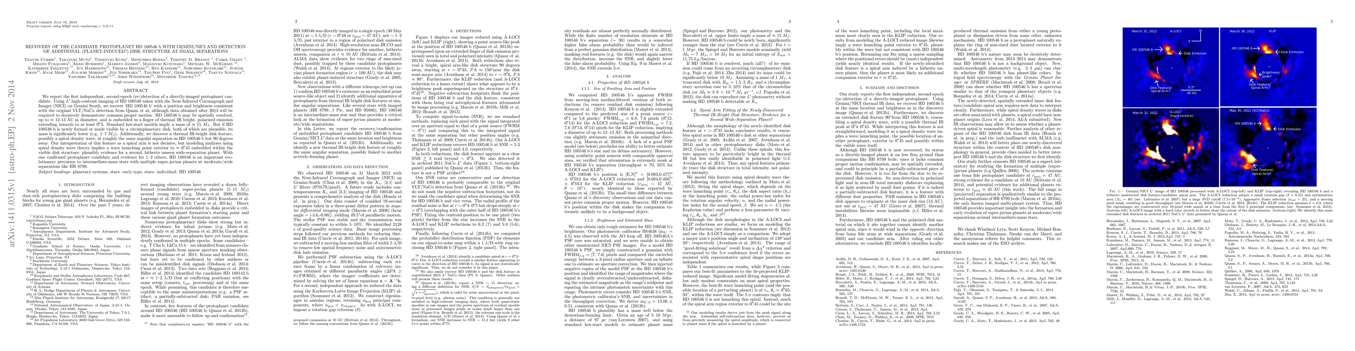 We report the first independent, second-epoch (re-)detection of a directly-imaged protoplanet candidate. Using $L^\prime$ high-contrast imaging of HD 100546 taken with the Near-Infrared Coronagraph and Imager (NICI) on Gemini South, we recover `HD 100546 b' with a position and brightness consistent with the original VLT/NaCo detection from Quanz et al, although data obtained after 2013 will be required to decisively demonstrate common proper motion. HD 100546 b may be spatially resolved, up to $\approx$ 12-13 AU in diameter, and is embedded in a finger of thermal IR bright, polarized emission extending inwards to at least 0.3". Standard hot-start models imply a mass of $\approx$ 15 $M_{J}$. But if HD 100546 b is newly formed or made visible by a circumplanetary disk, both of which are plausible, its mass is significantly lower (e.g. 1--7 $M_{J}$). Additionally, we discover a thermal IR-bright disk feature, possibly a spiral density wave, at roughly the same angular separation as HD 100546 b but 90 degrees away. Our interpretation of this feature as a spiral arm is not decisive, but modeling analyses using spiral density wave theory implies a wave launching point exterior to $\approx$ 0.45" embedded within the visible disk structure: plausibly evidence for a second, hitherto unseen wide-separation planet. With one confirmed protoplanet candidate and evidence for 1--2 others, HD 100546 is an important evolutionary precursor to intermediate-mass stars with multiple super-jovian planets at moderate/wide separations like HR 8799.