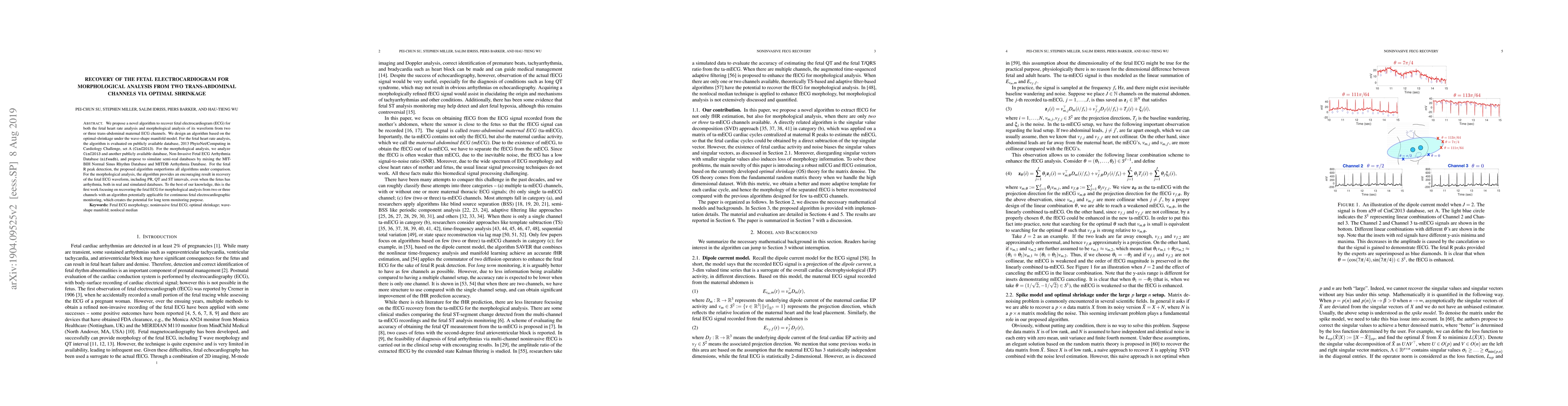 This paper introduces a novel algorithm for recovering fetal electrocardiogram (ECG) from two or three trans-abdominal channels, utilizing optimal shrinkage and nonlocal Euclidean median. The algorithm shows superior performance in fetal heart rate analysis and morphological waveform recovery, including intervals like PR, QT, and ST, even in cases of fetal arrhythmia.