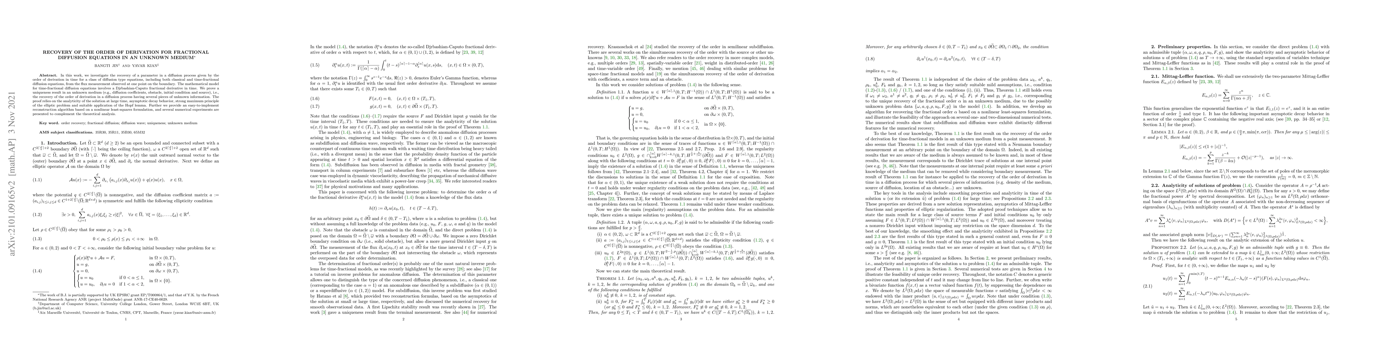 This paper investigates a method for recovering the order of derivation in fractional diffusion equations from boundary flux measurements, proving uniqueness despite unknown parameters. The approach leverages analytical properties and numerical reconstruction algorithms to determine the diffusion order effectively.