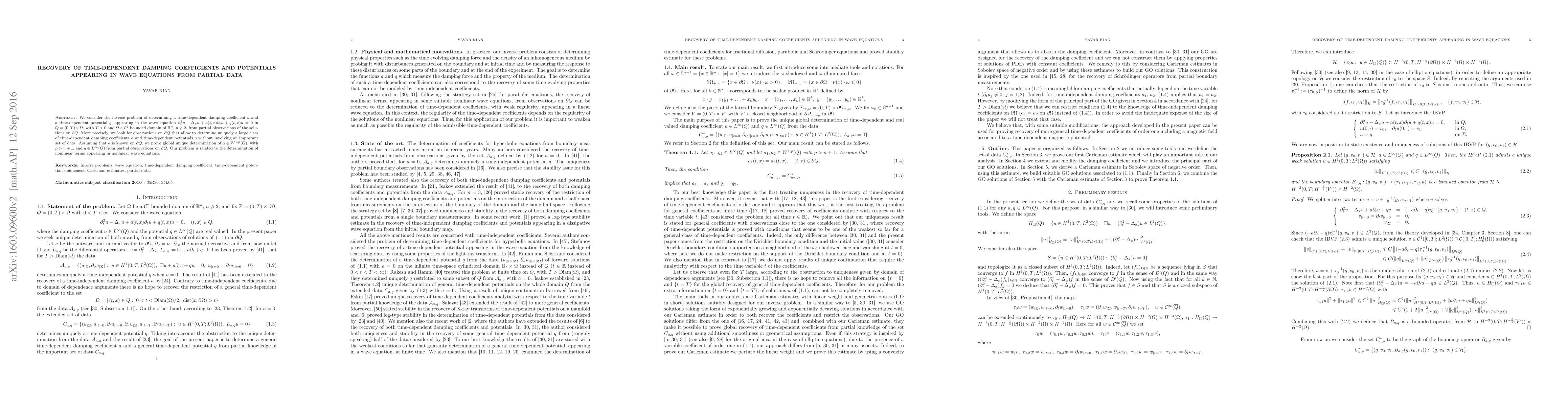 This paper addresses the inverse problem of identifying time-dependent damping coefficients and potentials in a wave equation from limited boundary observations. It proves global uniqueness in determining these coefficients and potentials using partial data on the boundary of the spatial domain.
