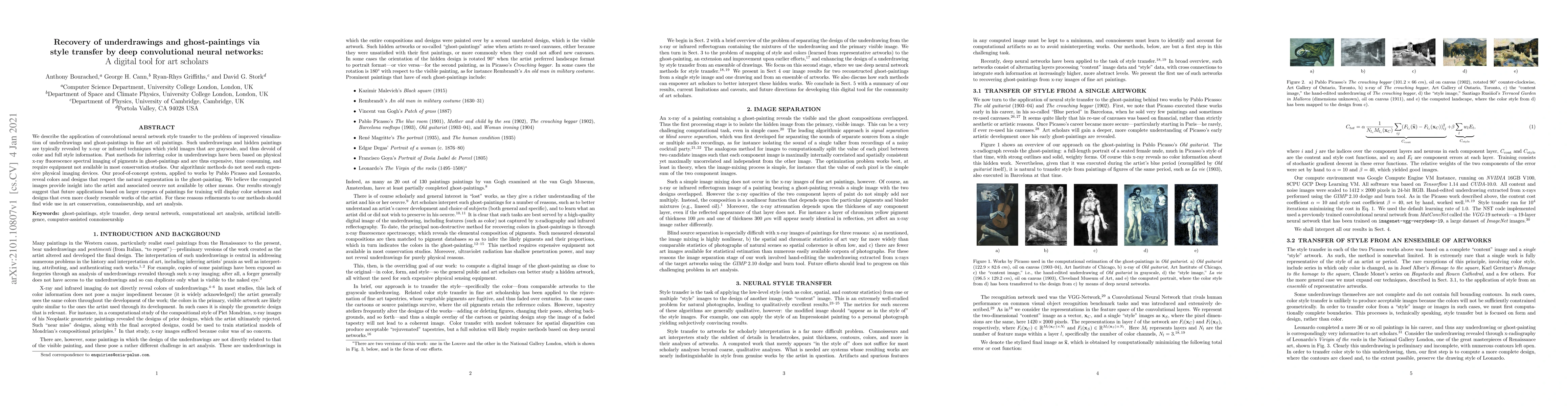 We describe the application of convolutional neural network style transfer to the problem of improved visualization of underdrawings and ghost-paintings in fine art oil paintings. Such underdrawings and hidden paintings are typically revealed by x-ray or infrared techniques which yield images that are grayscale, and thus devoid of color and full style information. Past methods for inferring color in underdrawings have been based on physical x-ray fluorescence spectral imaging of pigments in ghost-paintings and are thus expensive, time consuming, and require equipment not available in most conservation studios. Our algorithmic methods do not need such expensive physical imaging devices. Our proof-of-concept system, applied to works by Pablo Picasso and Leonardo, reveal colors and designs that respect the natural segmentation in the ghost-painting. We believe the computed images provide insight into the artist and associated oeuvre not available by other means. Our results strongly suggest that future applications based on larger corpora of paintings for training will display color schemes and designs that even more closely resemble works of the artist. For these reasons refinements to our methods should find wide use in art conservation, connoisseurship, and art analysis.