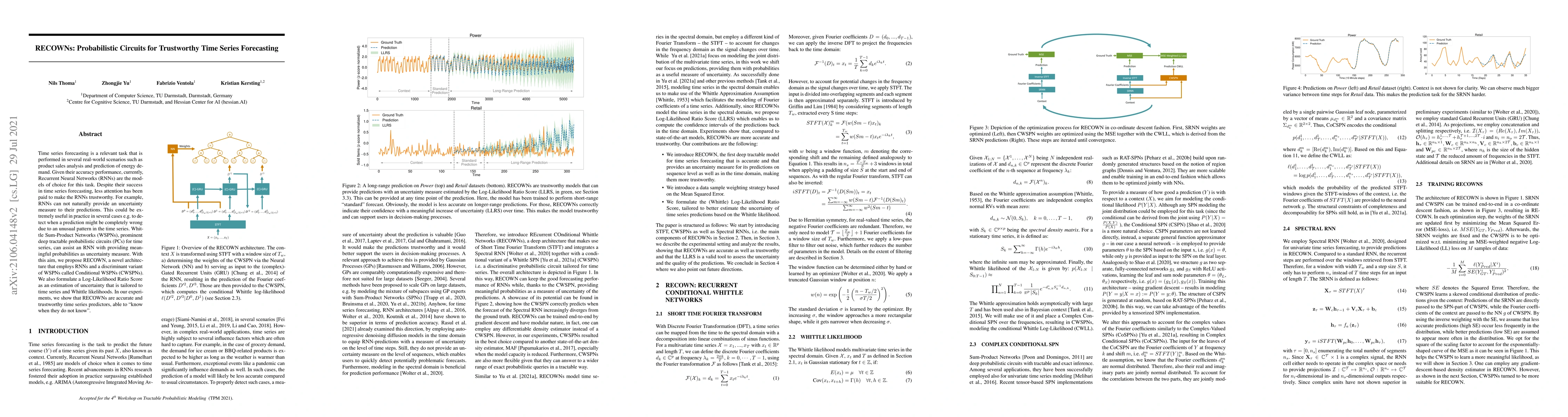 RECOWNs combine Recurrent Neural Networks (RNNs) with Conditional Whittle Sum-Product Networks (CWSPNs) to enhance time series forecasting with uncertainty measures. This hybrid model provides both accuracy and trustworthiness, enabling detection of unusual patterns and prediction confidence.