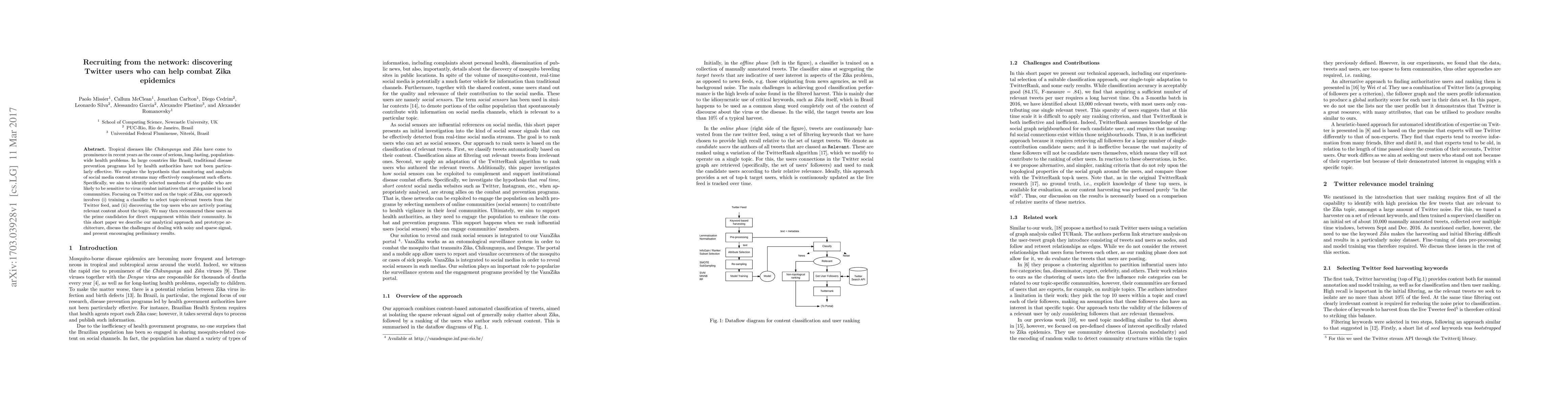 Tropical diseases like \textit{Chikungunya} and \textit{Zika} have come to prominence in recent years as the cause of serious, long-lasting, population-wide health problems. In large countries like Brasil, traditional disease prevention programs led by health authorities have not been particularly effective. We explore the hypothesis that monitoring and analysis of social media content streams may effectively complement such efforts. Specifically, we aim to identify selected members of the public who are likely to be sensitive to virus combat initiatives that are organised in local communities. Focusing on Twitter and on the topic of Zika, our approach involves (i) training a classifier to select topic-relevant tweets from the Twitter feed, and (ii) discovering the top users who are actively posting relevant content about the topic. We may then recommend these users as the prime candidates for direct engagement within their community. In this short paper we describe our analytical approach and prototype architecture, discuss the challenges of dealing with noisy and sparse signal, and present encouraging preliminary results.