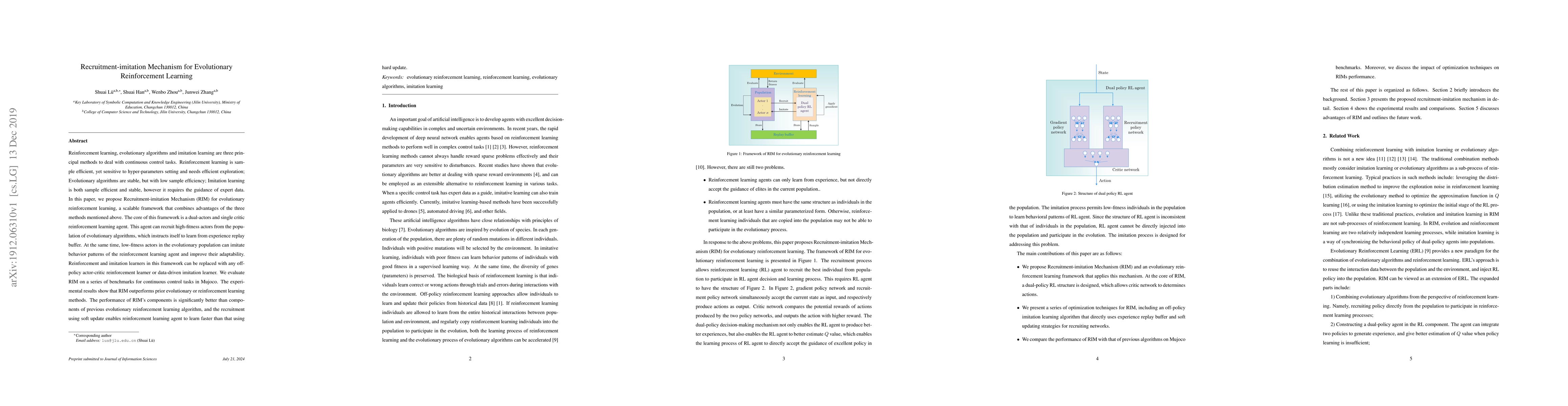 This paper proposes the Recruitment-imitation Mechanism (RIM) for evolutionary reinforcement learning, combining reinforcement, evolutionary, and imitation learning to tackle continuous control tasks. RIM employs a dual-actors and single critic agent that recruits high-fitness actors from an evolutionary population for reinforcement learning and allows low-fitness actors to imitate the reinforcement agent, achieving superior performance on Mujoco benchmarks compared to prior methods.