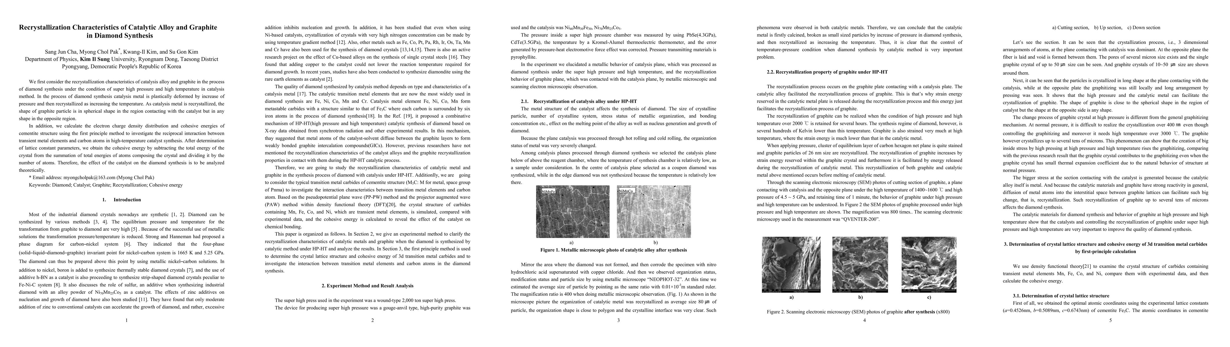 We first consider the recrystallization characteristics of catalysis alloy and graphite in the process of diamond synthesis under the condition of super high pressure and high temperature in catalysis method. In the process of diamond synthesis catalysis metal is plastically deformed by increase of pressure and then recrystallized as increasing the temperature. As catalysis metal is recrystallized, the shape of graphite particle is in spherical shape in the region contacting with the catalyst but in any shape in the opposite region. In addition, we calculate the electron charge density distribution and cohesive energies of cementite structure using the first principle method to investigate the reciprocal interaction between transient metal elements and carbon atoms in high-temperature catalyst synthesis. After determination of lattice constant parameters, we obtain the cohesive energy by subtracting the total energy of the crystal from the summation of total energies of atoms composing the crystal and dividing it by the number of atoms. Therefore, the effect of the catalyst on the diamond synthesis is to be analyzed theoretically.