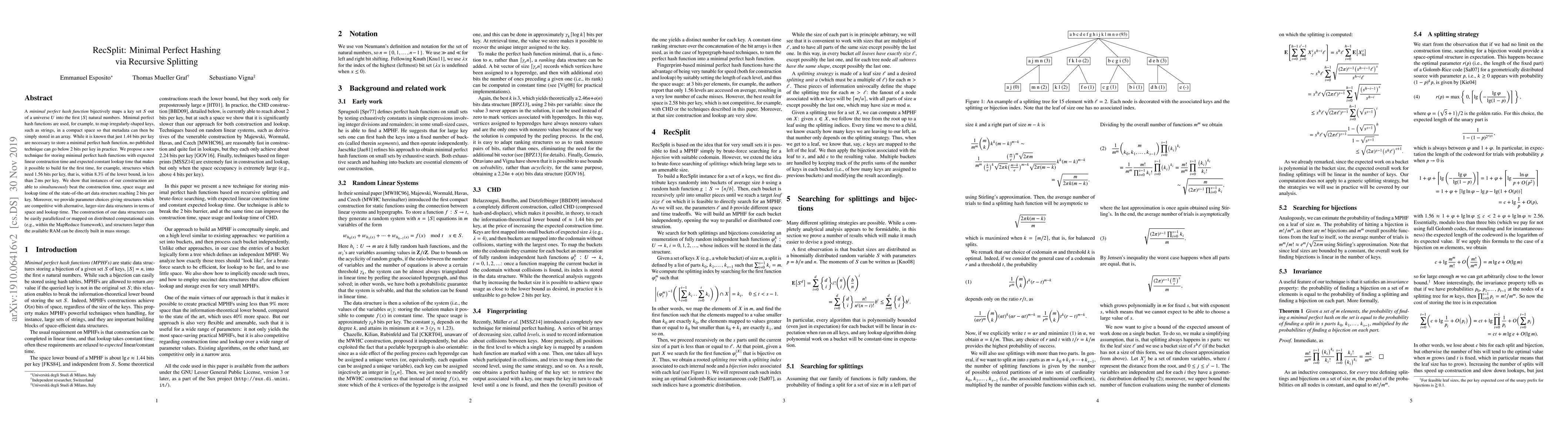 RecSplit introduces a novel technique for constructing minimal perfect hash functions that achieves near-optimal bit usage per key (1.56 bits) and significantly outperforms existing methods in construction time, space efficiency, and lookup speed. The method enables linear construction time and constant lookup time, and it can be parallelized for scalability.