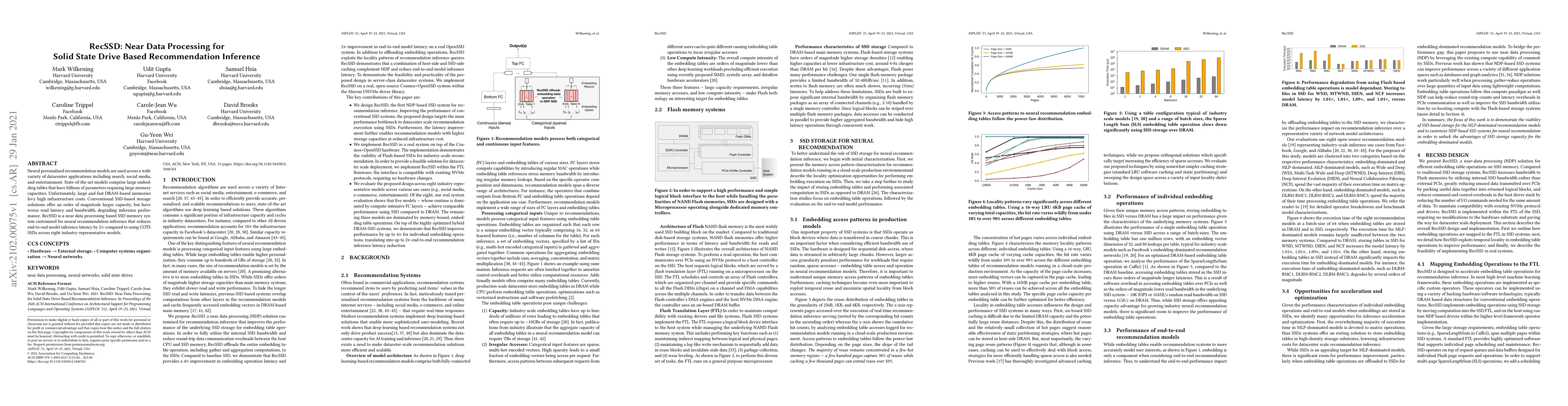 RecSSD is a novel SSD memory system designed to optimize neural recommendation model inference by leveraging near data processing. It significantly reduces inference latency by 2X compared to conventional SSDs, addressing the high infrastructure costs and latency issues of DRAM-based memory systems.