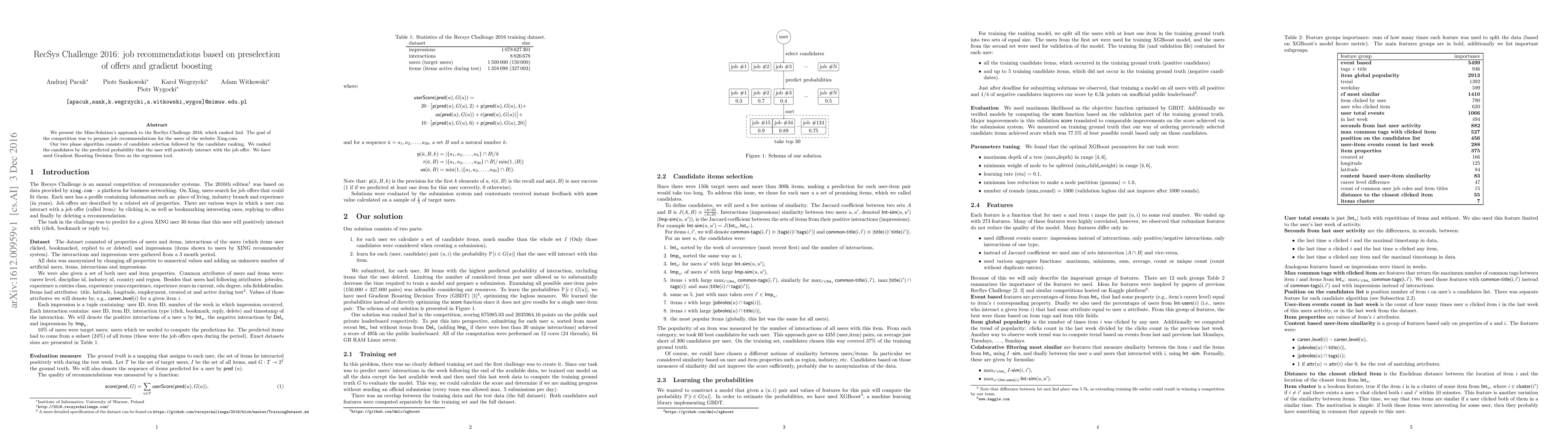 Researchers presented a 2nd-place finish at the RecSys Challenge 2016 using a two-phase algorithm combining candidate selection and gradient boosting decision trees to recommend job offers on Xing.com.