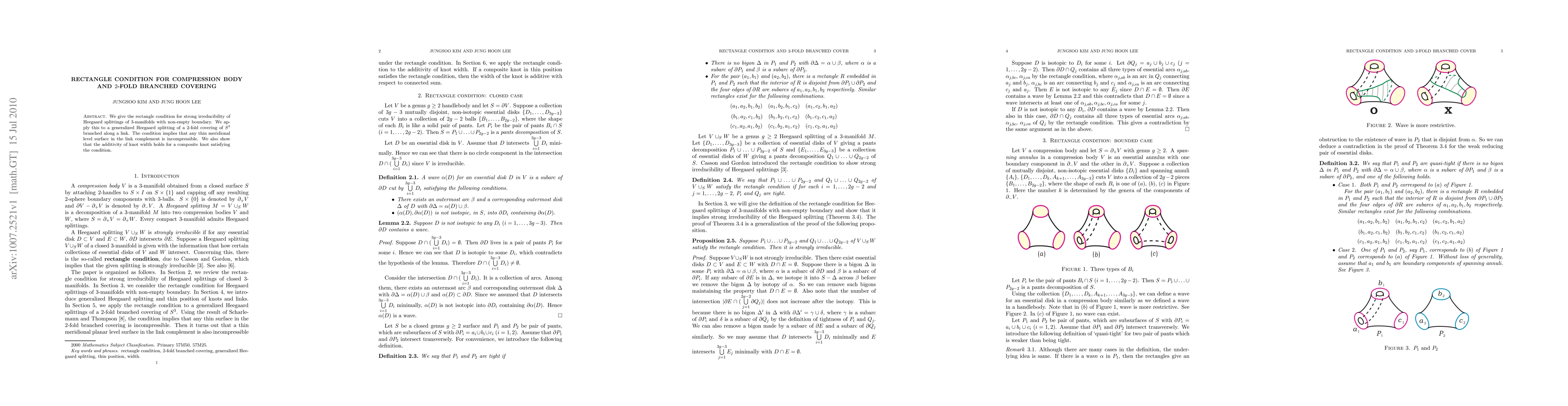 The paper presents a rectangle condition for strong irreducibility of Heegaard splittings in 3-manifolds with boundary, applicable to 2-fold branched coverings of S³. This condition ensures incompressibility of certain level surfaces and supports additivity of knot width for specific composite knots.