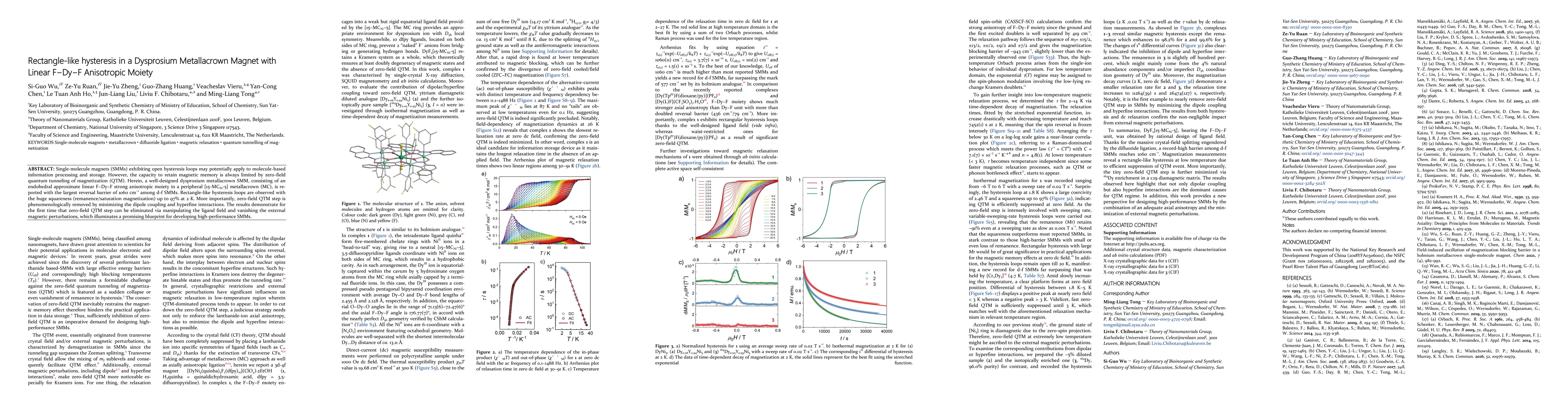 This paper reports a dysprosium metallacrown single-molecule magnet with a linear F-Dy-F anisotropic moiety, exhibiting rectangle-like hysteresis loops and a high reversal barrier of 1060 cm-1. The study demonstrates the elimination of zero-field quantum tunneling, paving the way for advanced molecule-based information storage.