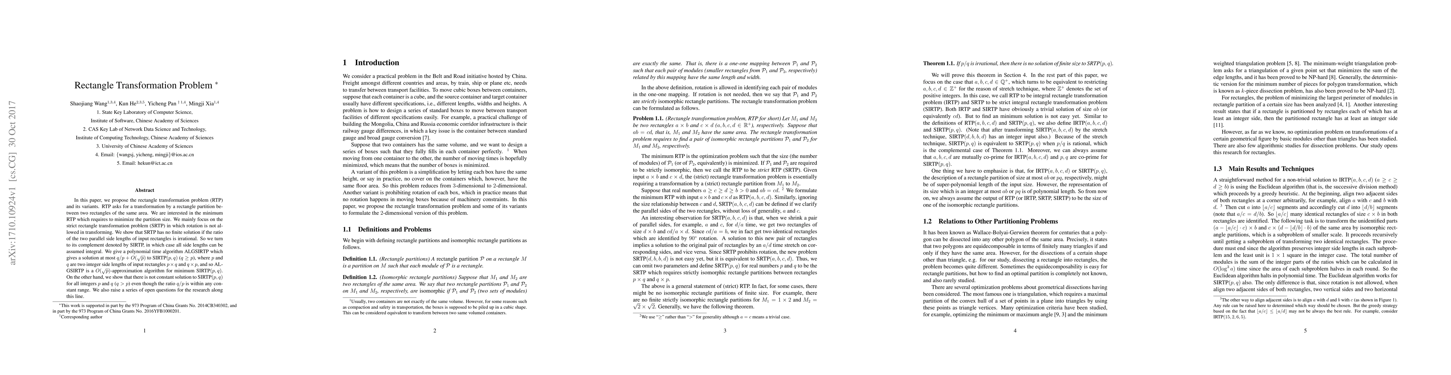 This paper introduces the rectangle transformation problem (RTP) and its variant, the strict rectangle transformation problem (SRTP), focusing on minimizing partition size without rotation. It proves that SRTP lacks a finite solution when the side length ratio is irrational, and presents a polynomial time algorithm ALGSIRTP for the integral side length case SIRTP, providing a $O(\sqrt{p})$-approximation. It also concludes that SIRTP does not have a constant solution for all integer side lengths.