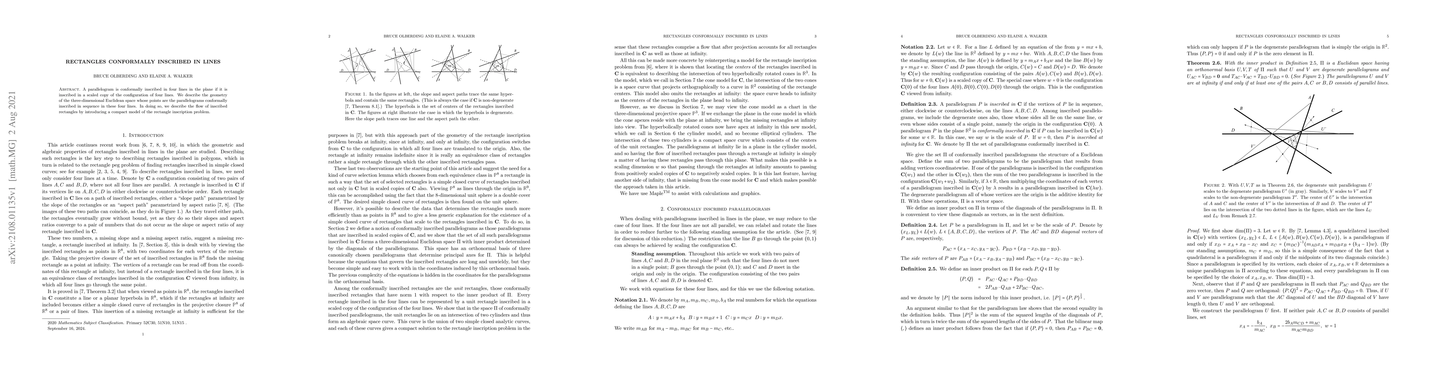 A parallelogram is conformally inscribed in four lines in the plane if it is inscribed in a scaled copy of the configuration of four lines. We describe the geometry of the three-dimensional Euclidean space whose points are the parallelograms conformally inscribed in sequence in these four lines. In doing so, we describe the flow of inscribed rectangles by introducing a compact model of the rectangle inscription problem.