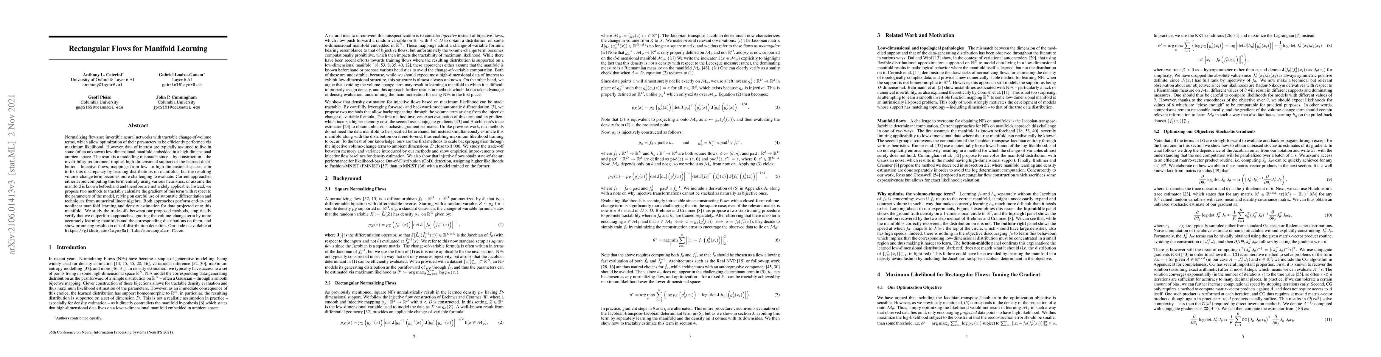Normalizing flows are invertible neural networks with tractable change-of-volume terms, which allow optimization of their parameters to be efficiently performed via maximum likelihood. However, data of interest are typically assumed to live in some (often unknown) low-dimensional manifold embedded in a high-dimensional ambient space. The result is a modelling mismatch since -- by construction -- the invertibility requirement implies high-dimensional support of the learned distribution. Injective flows, mappings from low- to high-dimensional spaces, aim to fix this discrepancy by learning distributions on manifolds, but the resulting volume-change term becomes more challenging to evaluate. Current approaches either avoid computing this term entirely using various heuristics, or assume the manifold is known beforehand and therefore are not widely applicable. Instead, we propose two methods to tractably calculate the gradient of this term with respect to the parameters of the model, relying on careful use of automatic differentiation and techniques from numerical linear algebra. Both approaches perform end-to-end nonlinear manifold learning and density estimation for data projected onto this manifold. We study the trade-offs between our proposed methods, empirically verify that we outperform approaches ignoring the volume-change term by more accurately learning manifolds and the corresponding distributions on them, and show promising results on out-of-distribution detection. Our code is available at https://github.com/layer6ai-labs/rectangular-flows.