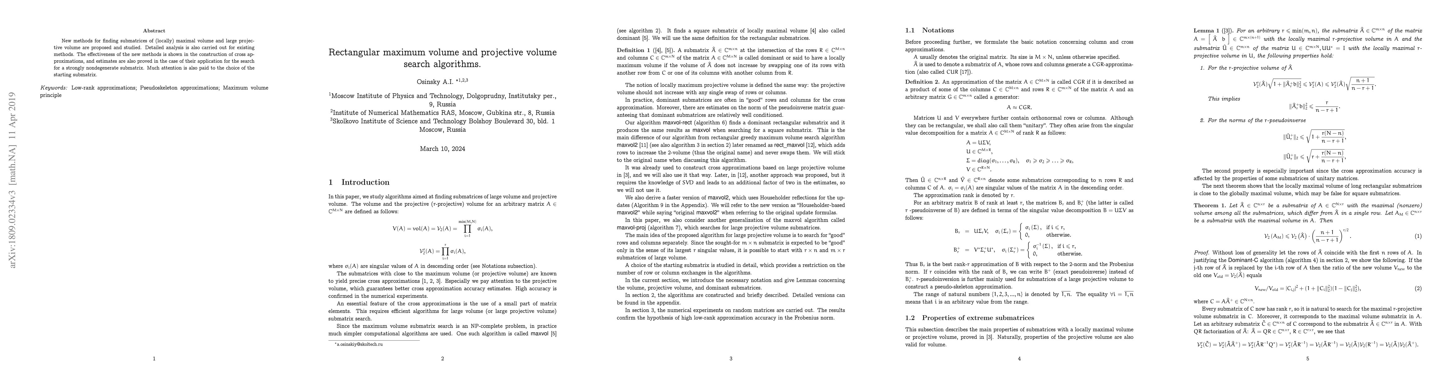 New methods for finding large submatrices with maximal volume and projective volume are proposed, along with improved analysis of existing methods, showcasing their effectiveness in cross approximation construction and estimates for strongly nondegenerate submatrix search.