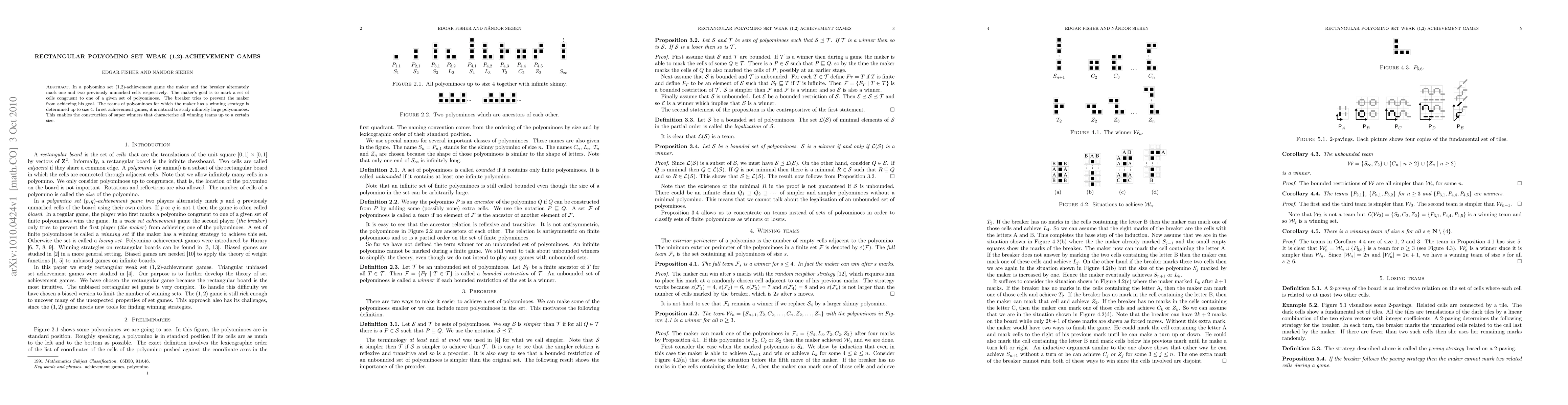 This paper investigates (1,2)-achievement games using rectangular polyomino sets, determining the winning strategies for teams up to size 4. It also explores the concept of super winners for infinitely large polyominoes to characterize all winning teams up to a certain size.