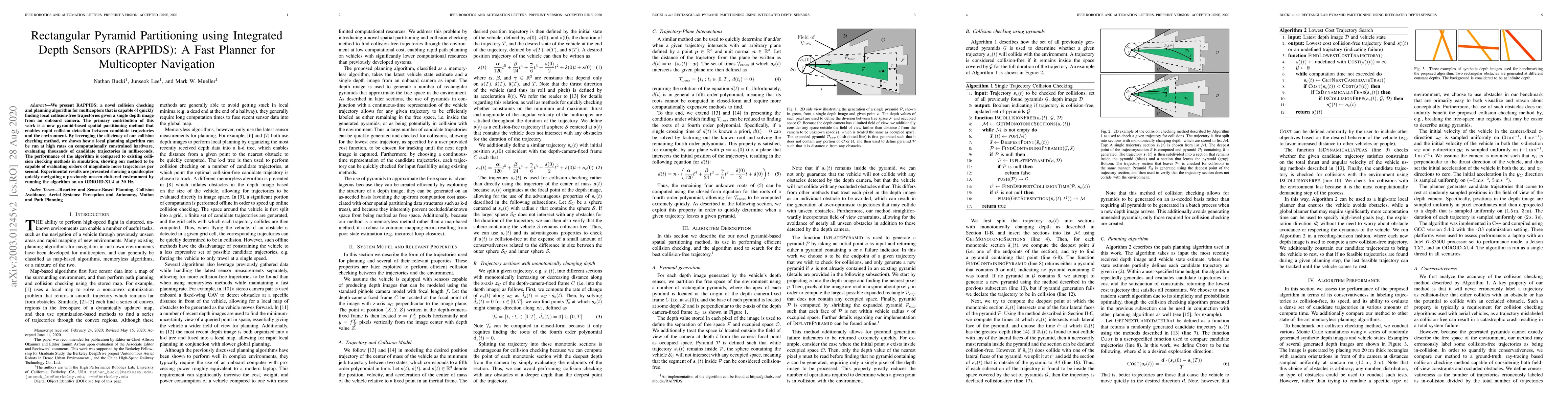 A new algorithm called RAPPIDS quickly finds safe paths for multicopters to navigate through cluttered environments using a single depth image from a camera.