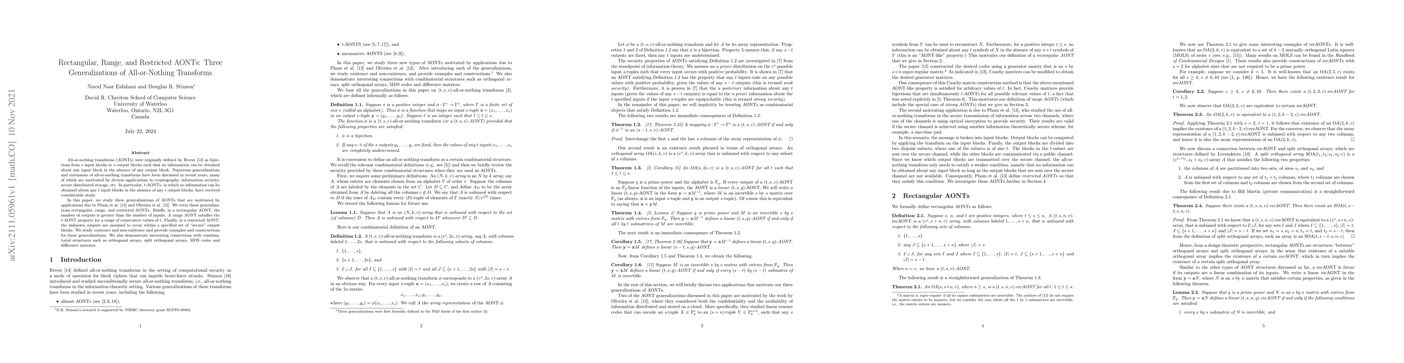 This paper explores three novel generalizations of all-or-nothing transforms (AONTs): rectangular, range, and restricted AONTs, motivated by applications in cryptography and secure storage. It examines their existence, provides constructions, and highlights connections to combinatorial structures like orthogonal arrays and MDS codes.