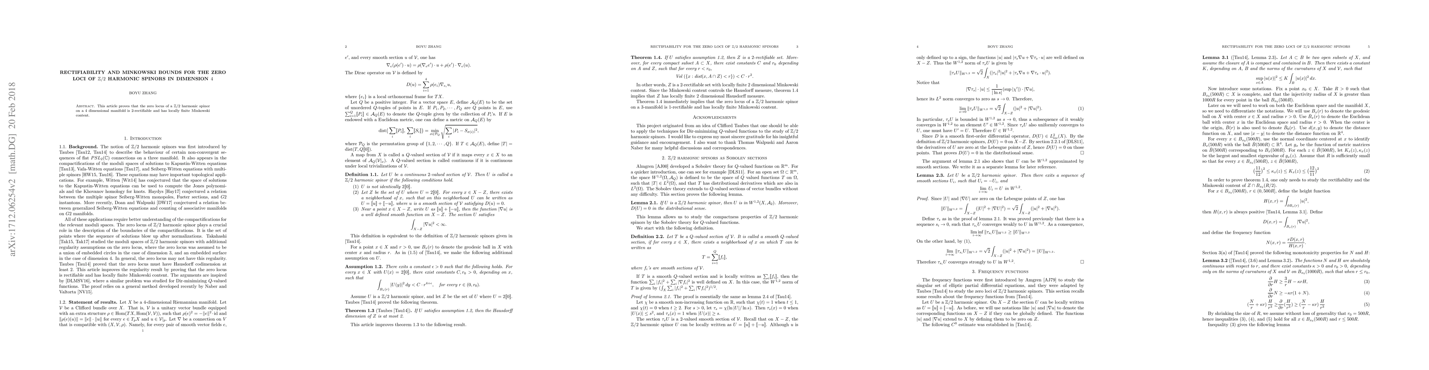 A research paper proves that the zero loci of $oldsymbol{rac{1}{2}}$ harmonic spinors on a 4-dimensional manifold are both 2-rectifiable and have locally finite Minkowski content.