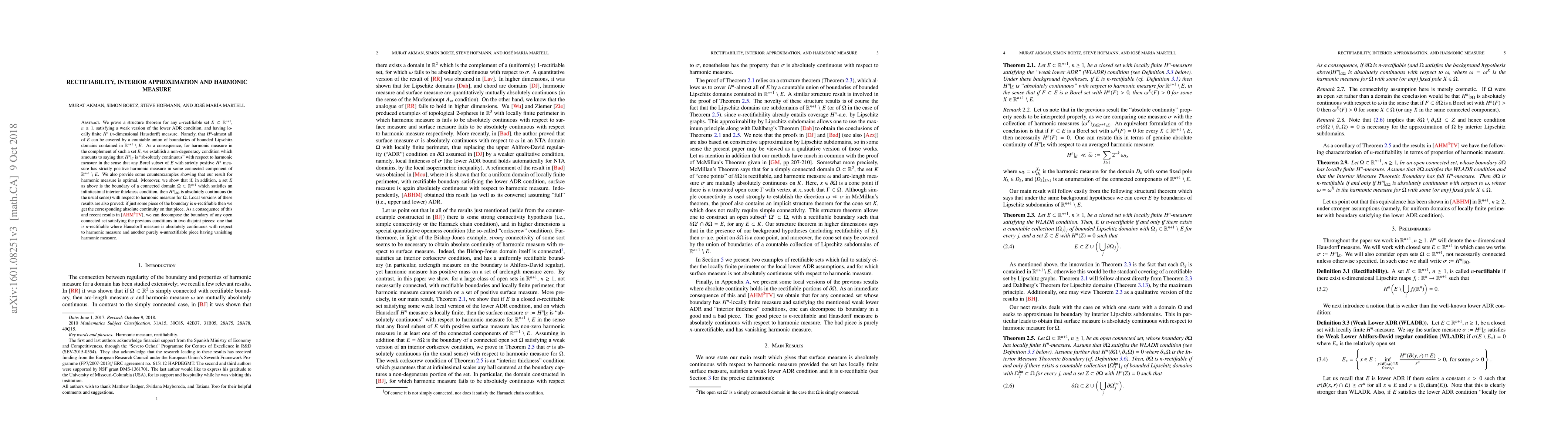 This paper proves a structure theorem for $n$-rectifiable sets in $\mathbb{R}^{n+1}$ under a weak lower ADR condition, showing that their boundaries can be approximated by Lipschitz domains. It establishes absolute continuity between $n$-dimensional Hausdorff measure and harmonic measure in the complement of such sets, with optimal counterexamples and local versions of these results.