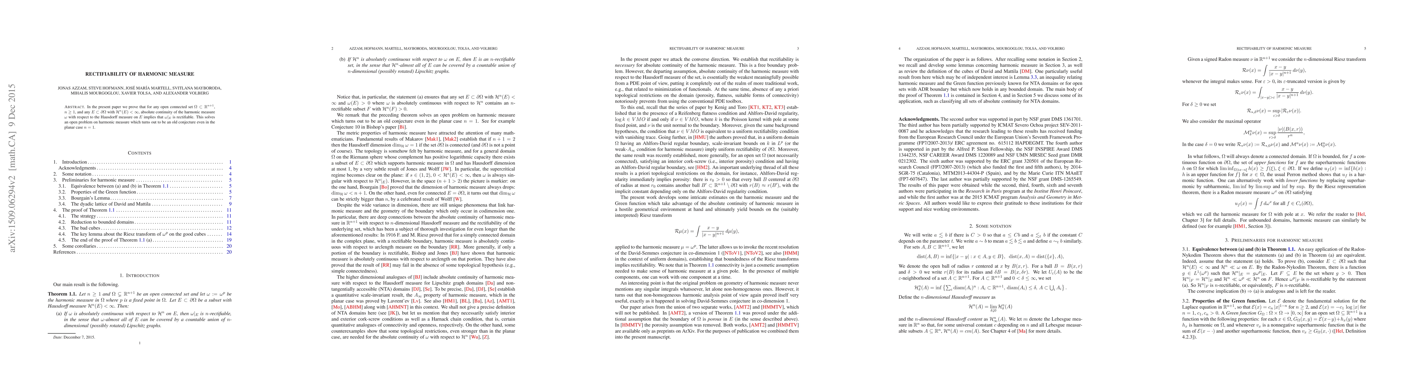 This paper proves that absolute continuity of harmonic measure with respect to the Hausdorff measure on a subset of the boundary of an open connected set in $\mathbb{R}^{n+1}$ implies rectifiability of the harmonic measure, solving an old conjecture in the planar case.