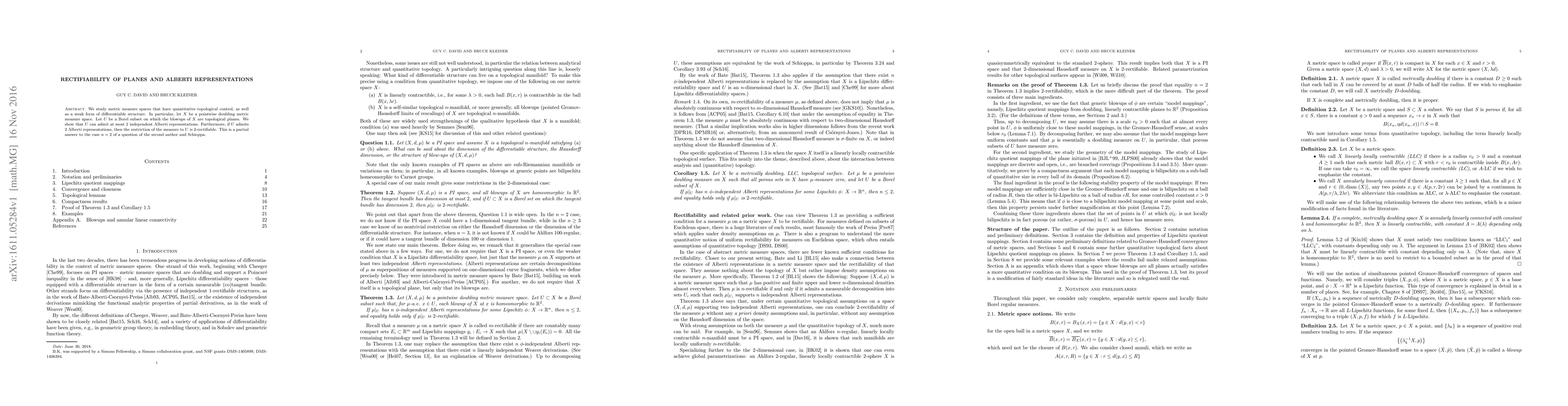 This paper investigates the rectifiability of planes in metric measure spaces with topological control and weak differentiable structure, proving that a Borel subset with plane blowups can have at most two independent Alberti representations, and if it has two, the measure is 2-rectifiable. This addresses a specific case of a broader question posed by the second author and Schioppa.