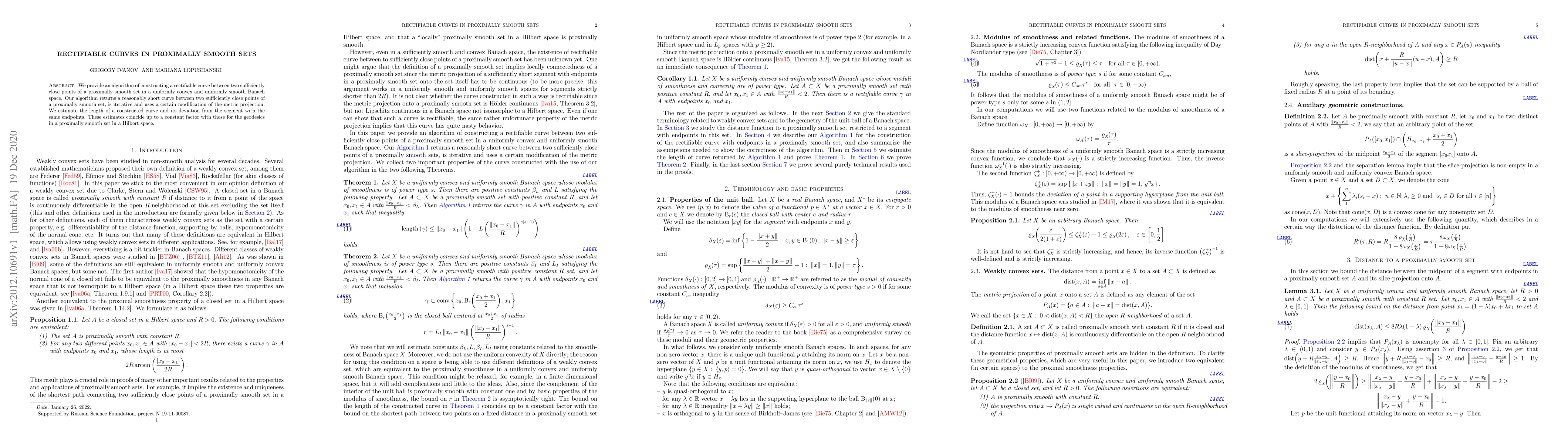 The paper proposes an iterative algorithm to construct a rectifiable curve between two points in a proximally smooth set within a uniformly convex and smooth Banach space, utilizing a modified metric projection. The curve's length and deviation from a straight line are estimated, with these estimates matching those for geodesics in a Hilbert space.