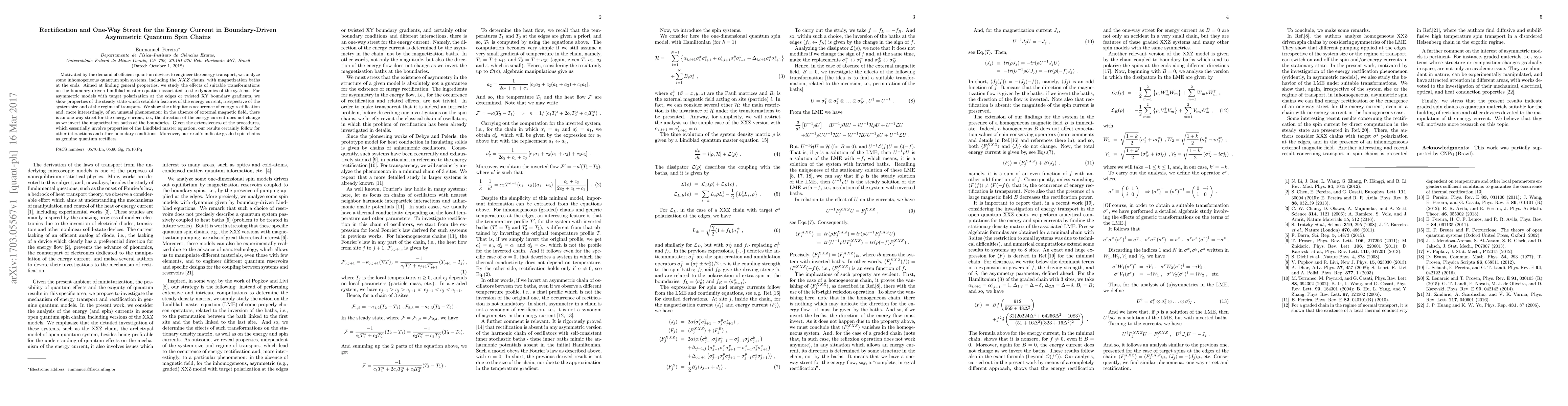 Motivated by the demand of efficient quantum devices to engineer the energy transport, we analyze some inhomogeneous quantum spin systems, including the XXZ chains, with magnetization baths at the ends. Aimed at finding general properties, we study the effects of suitable transformations on the boundary-driven Lindblad master equation associated to the dynamics of the systems. For asymmetric models with target polarization at the edges or twisted XY boundary gradients, we show properties of the steady state which establish features of the energy current, irrespective of the system size and of the regime of transport. We show the ubiquitous occurrence of energy rectification and, more interestingly, of an unusual phenomenon: in the absence of external magnetic field, there is an one-way street for the energy current, i.e., the direction of the energy current does not change as we invert the magnetization baths at the boundaries. Given the extensiveness of the procedures, which essentially involve properties of the Lindblad master equation, our results certainly follow for other interactions and other boundary conditions. Moreover, our results indicate graded spin chains as genuine quantum rectifiers.