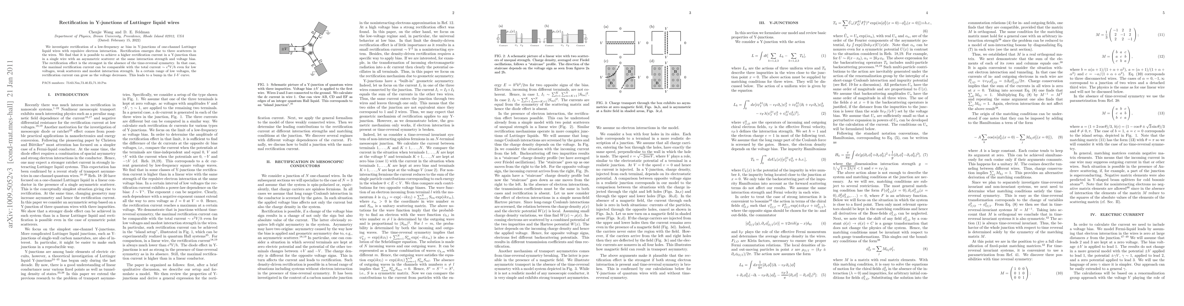 This paper explores rectification of low-frequency ac bias in Y-junctions of Luttinger liquid wires with repulsive electron interactions, finding higher rectification currents in Y-junctions compared to single wires with asymmetric scatterers. The strongest rectification occurs without time-reversal symmetry, potentially reaching currents comparable to $\sim e^2V/h$ under low voltages.