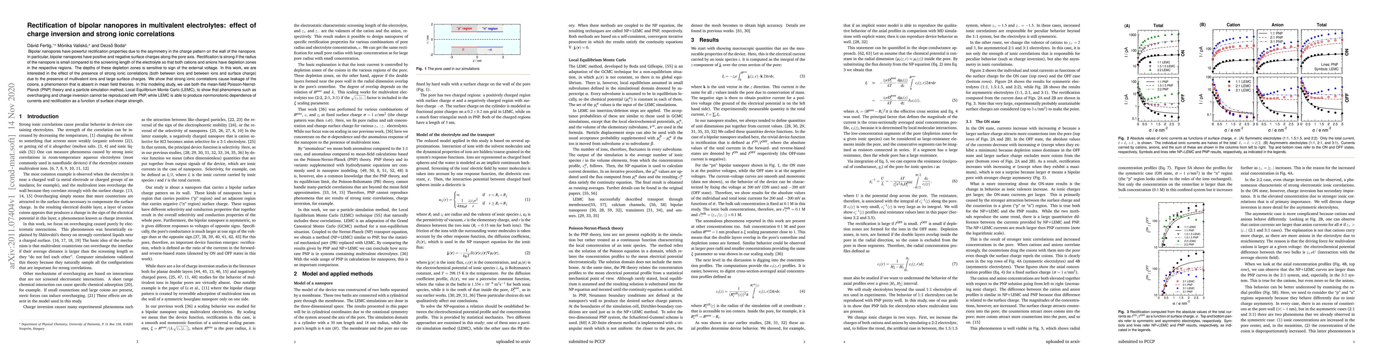 Bipolar nanopores have powerful rectification properties due to the asymmetry in the charge pattern on the wall of the nanopore. In particular, bipolar nanopores have positive and negative surface charges along the pore axis. Rectification is strong if the radius of the nanopore is small compared to the screening length of the electrolyte so that both cations and anions have depletion zones in the respective regions. The depths of these depletion zones is sensitive to sign of the external voltage. In this work, we are interested in the effect of the presence of strong ionic correlations (both between ions and between ions and surface charge) due to the presence of multivalent ions and large surface charges. We show that strong ionic correlations cause leakage of the coions, a phenomenon that is absent in mean field theories. In this modeling study, we use both the mean-field Poisson-Nernst-Planck (PNP) theory and a particle simulation method, Local Equilibrium Monte Carlo (LEMC), to show that phenomena such as overcharging and charge inversion cannot be reproduced with PNP, while LEMC is able to produce nonmonotonic dependence of currents and rectification as a function of surface charge strength.