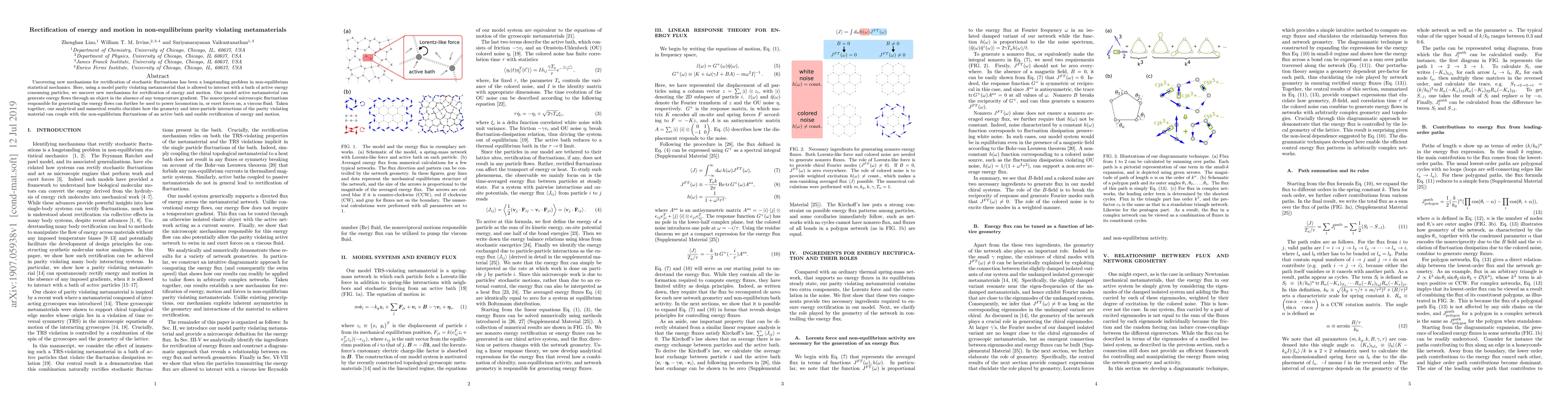 Uncovering new mechanisms for rectification of stochastic fluctuations has been a longstanding problem in non-equilibrium statistical mechanics. Here, using a model parity violating metamaterial that is allowed to interact with a bath of active energy consuming particles, we uncover new mechanisms for rectification of energy and motion. Our model active metamaterial can generate energy flows through an object in the absence of any temperature gradient. The nonreciprocal microscopic fluctuations responsible for generating the energy flows can further be used to power locomotion in, or exert forces on, a viscous fluid. Taken together, our analytical and numerical results elucidate how the geometry and inter-particle interactions of the parity violating material can couple with the non-equilibrium fluctuations of an active bath and enable rectification of energy and motion.