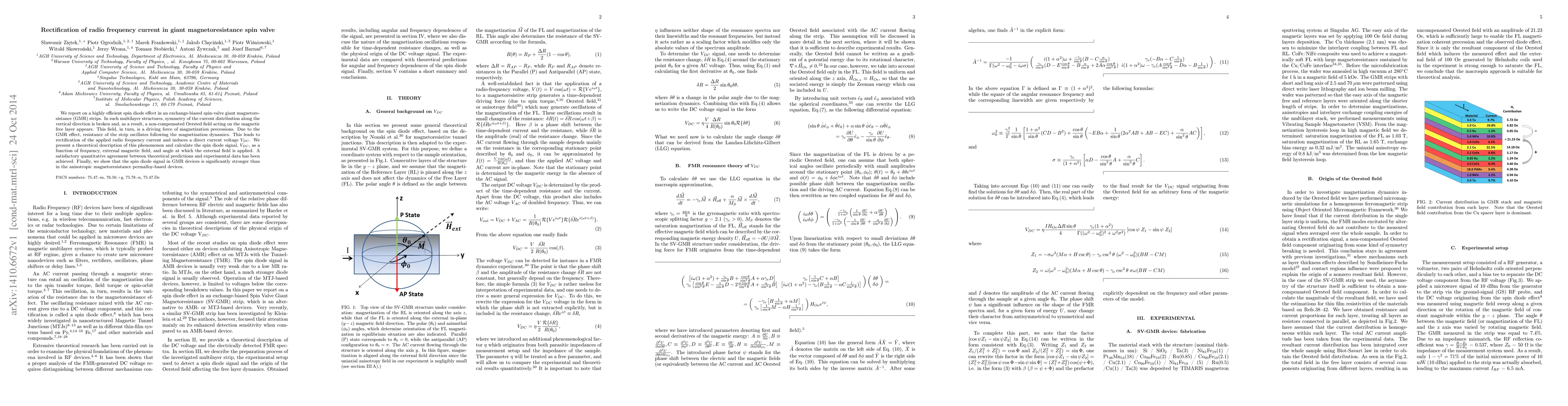 This paper reports on a highly efficient spin diode effect in giant magnetoresistance spin-valve structures, where rectification of radio frequency current is achieved due to magnetization precessions driven by an Oersted field. Theoretical and experimental results show strong spin diode signals in GMR devices compared to anisotropic magnetoresistance devices.