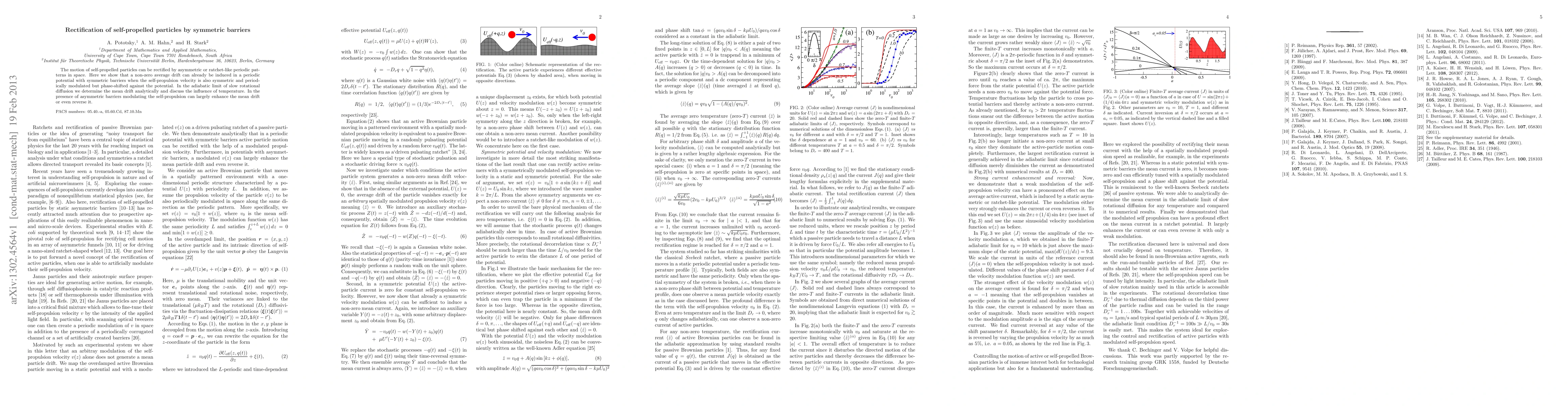 This paper demonstrates that self-propelled particles can be rectified using symmetric barriers if their self-propulsion velocity is periodically modulated in a phase-shifted manner. The authors analytically determine the mean drift in the adiabatic limit and discuss the impact of temperature, showing that asymmetric barriers can significantly enhance or reverse the induced drift.