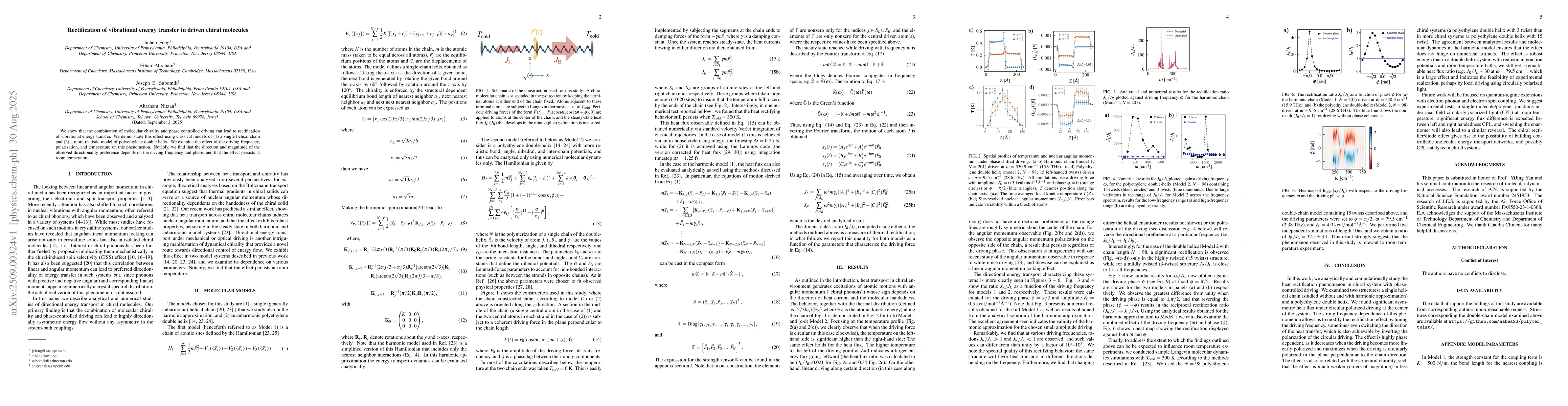 We show that the combination of molecular chirality and phase controlled driving can lead to rectification of vibrational energy transfer. We demonstrate this effect using classical models of (1) a single helical chain and (2) a more realistic model of polyethylene double helix. We examine the effect of the driving frequency, polarization, and temperature on this phenomenon. Notably, we find that the direction and magnitude of the observed directionality preference depends on the driving frequency and phase, and that the effect persists at room temperature.