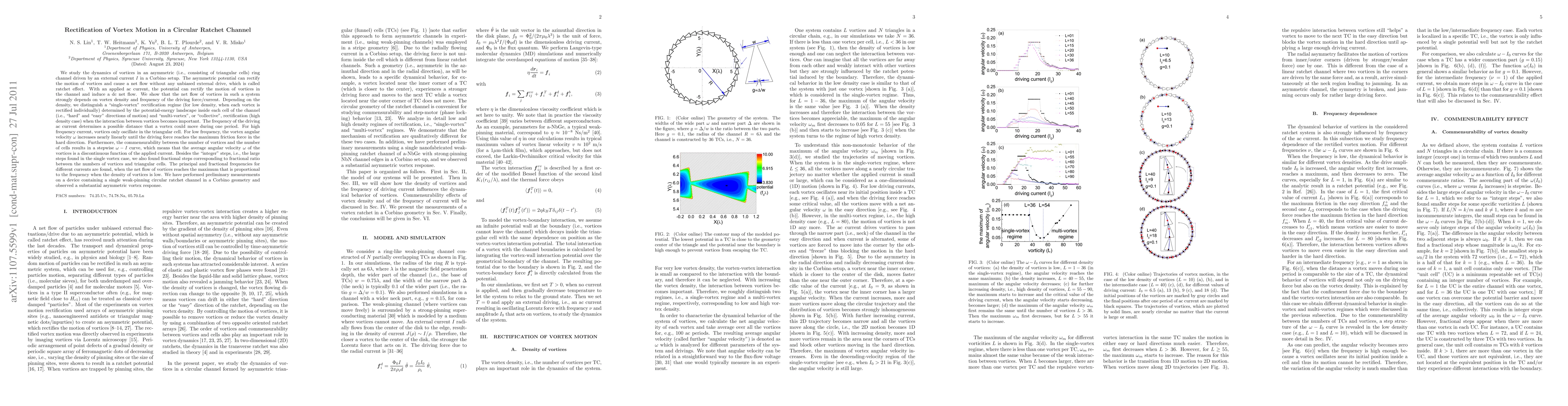 The paper presents a detailed analysis of vortex rectification in circular ratchet channels, identifying distinct regimes based on vortex density and frequency, and observing commensurability effects leading to stepwise angular velocity-current characteristics.