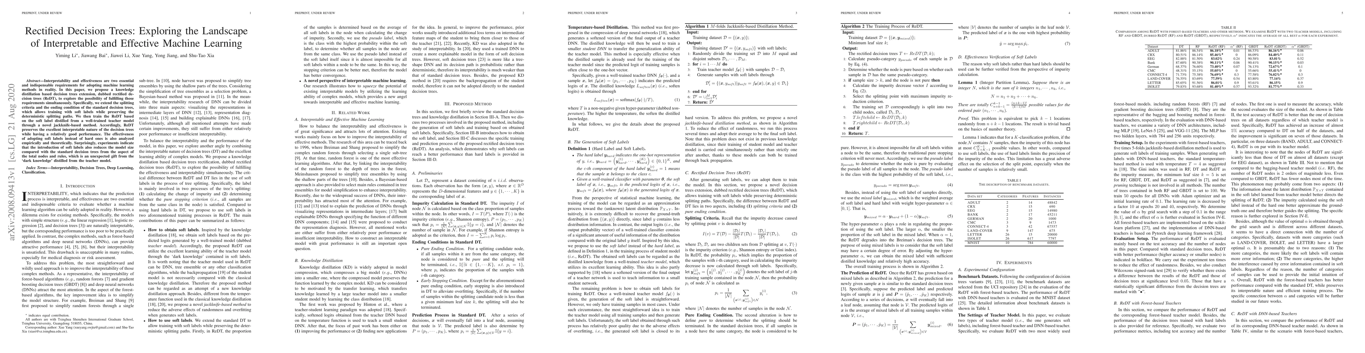 This paper proposes rectified decision trees (ReDT) to enhance interpretability and effectiveness in machine learning. ReDT incorporates knowledge distillation and soft labels, achieving better performance while maintaining the interpretability of traditional decision trees, and surprisingly, reducing model size.