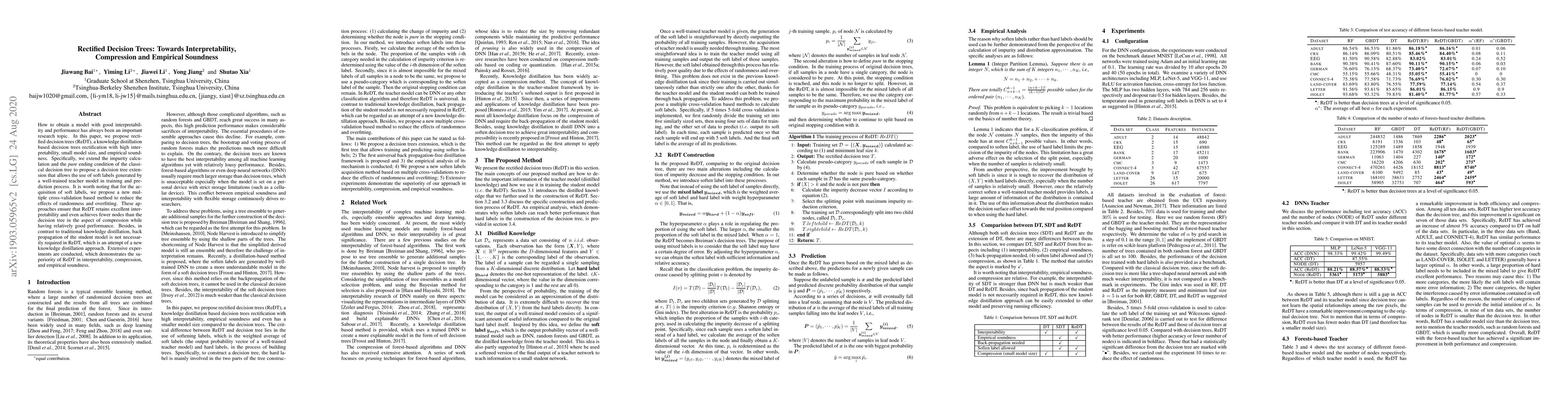This paper introduces rectified decision trees (ReDT), a knowledge distillation method that enhances interpretability, model compression, and empirical performance. ReDT employs soft labels from a teacher model and a novel cross-validation technique to reduce randomness and overfitting, achieving fewer nodes than traditional decision trees while maintaining good performance.