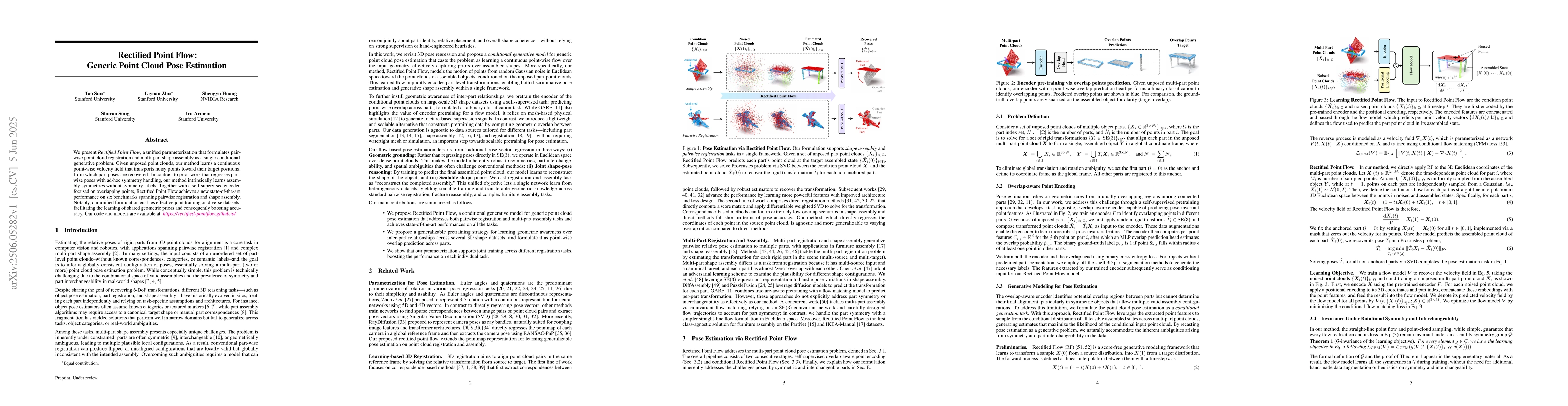 Rectified Point Flow method unifies point cloud registration and shape assembly into a single generative problem, achieving state-of-the-art performance on six benchmarks without explicit symmetry labels.