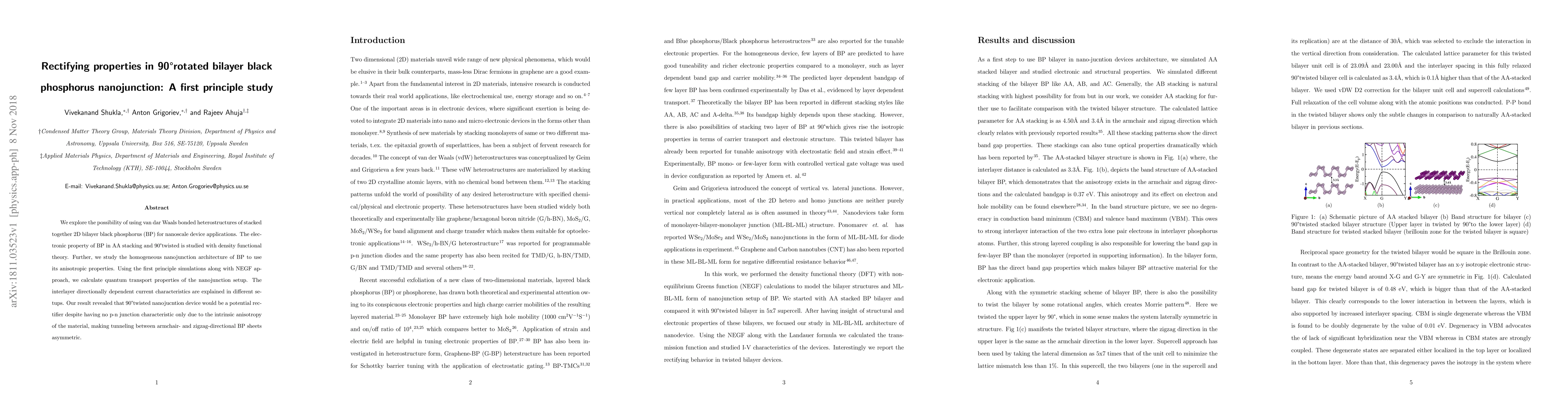We explore the possibility of using van dar Waals bonded heterostructures of stacked together 2D bilayer black phosphorus (BP) for nanoscale device applications. The electronic property of BP in AA stacking and 90{\deg} twisted is studied with density functional theory. Further, we study the homogeneous nanojunction architecture of BP to use its anisotropic properties. Using the first principle simulations along with NEGF approach, we calculate quantum transport properties of the nanojunction setup. The interlayer directionally dependent current characteristics are explained in different setups. Our result revealed that 90{\deg} twisted nanojucntion device would be a potential rectifier despite having no p-n junction characteristic only due to the intrinsic anisotropy of the material, making tunneling between armchair- and zigzag-directional BP sheets asymmetric.