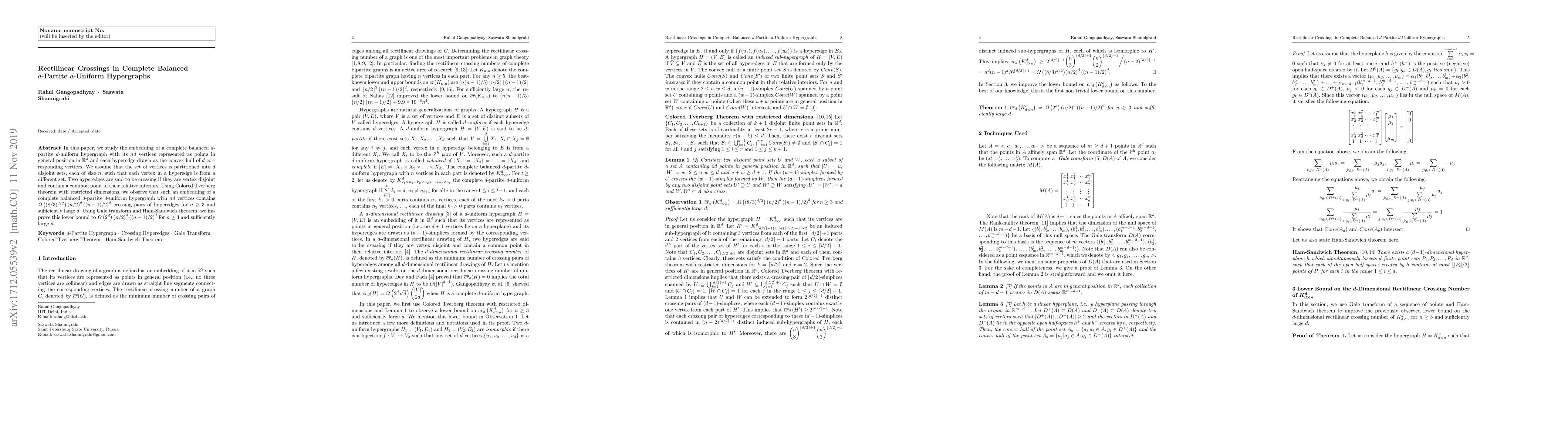 This paper investigates the embedding of a complete balanced $d$-partite $d$-uniform hypergraph in $\mathbb{R}^d$ and examines rectilinear crossings between its hyperedges. It establishes a lower bound for crossing pairs using the Generalized Colored Tverberg Theorem and improves it further with the Gale Transform and the Ham-Sandwich Theorem.