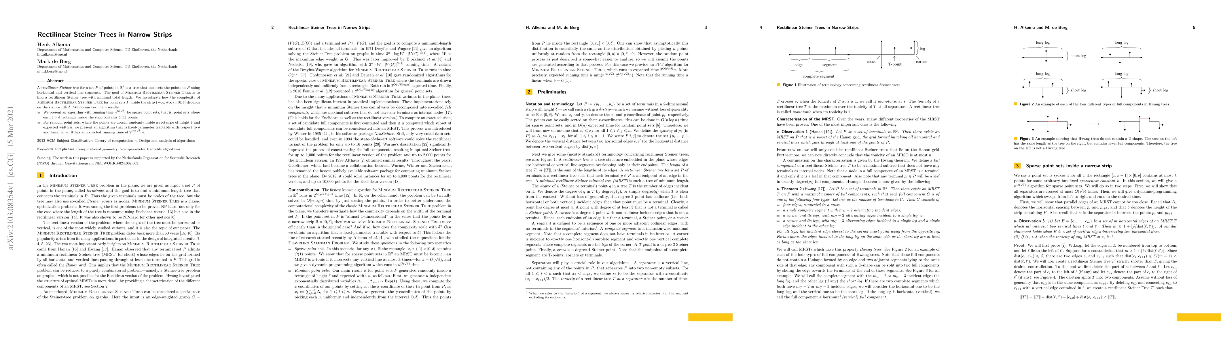 This paper explores the complexity of finding minimal rectilinear Steiner trees for point sets within narrow strips. It presents an efficient algorithm for sparse point sets and a fixed-parameter tractable algorithm for random point sets, both with respect to the strip width.