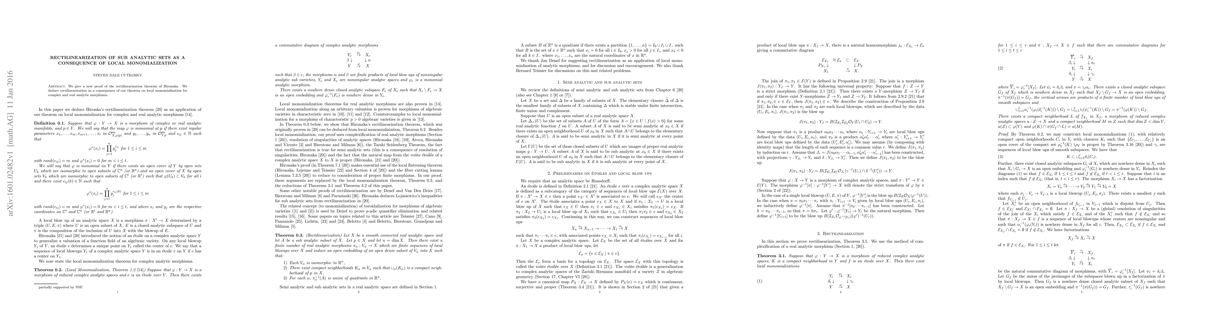 We give a new proof of the rectilinearization theorem of Hironaka. We deduce rectilinearization as a consequence of our theorem on local monomialization for complex and real analytic morphisms.