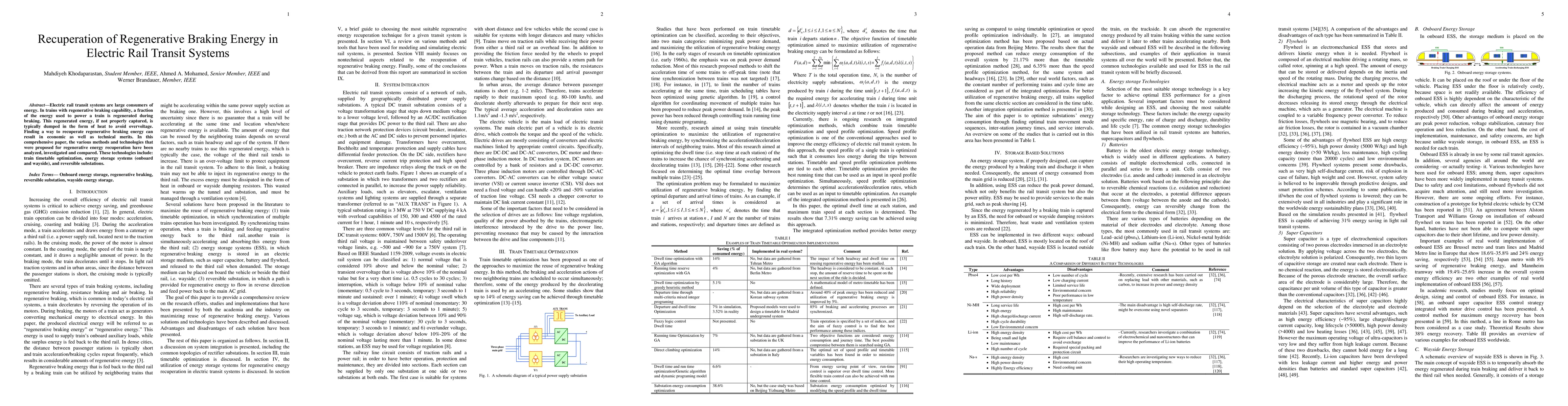 This paper analyzes and compares various methods for recuperating regenerative braking energy in electric rail transit systems, including timetable optimization, onboard and wayside energy storage, and reversible substations, to enhance energy efficiency and economic benefits.